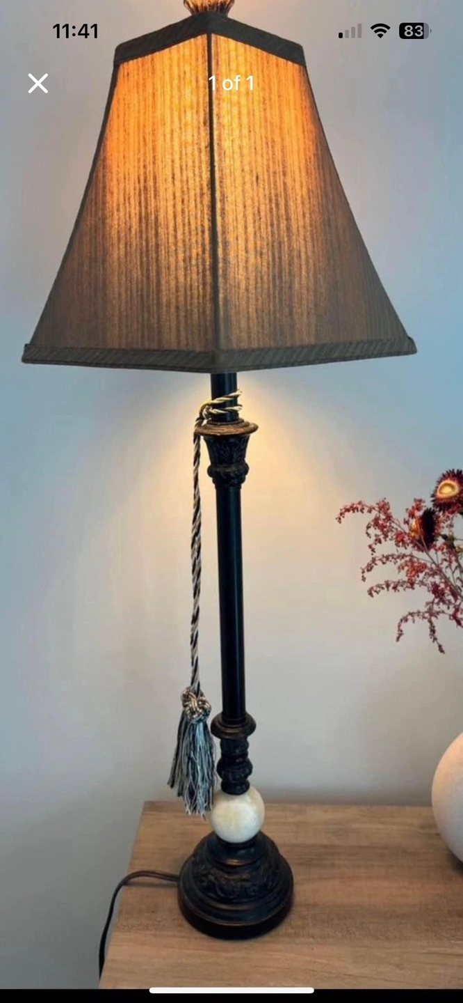 5Beautiful table lamp. Features a dark bronze finish, alabaster base, and a stylish lampshade. Black and white tassel pull.