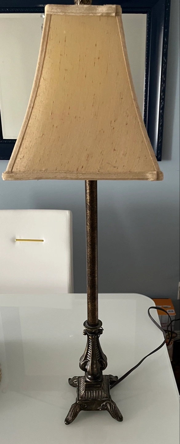 Ornate table lamp, dark bronze finish. Features a tall, slender stem and detailed base. Beige fabric shade included. Adds a touch of sophistication to any space.
