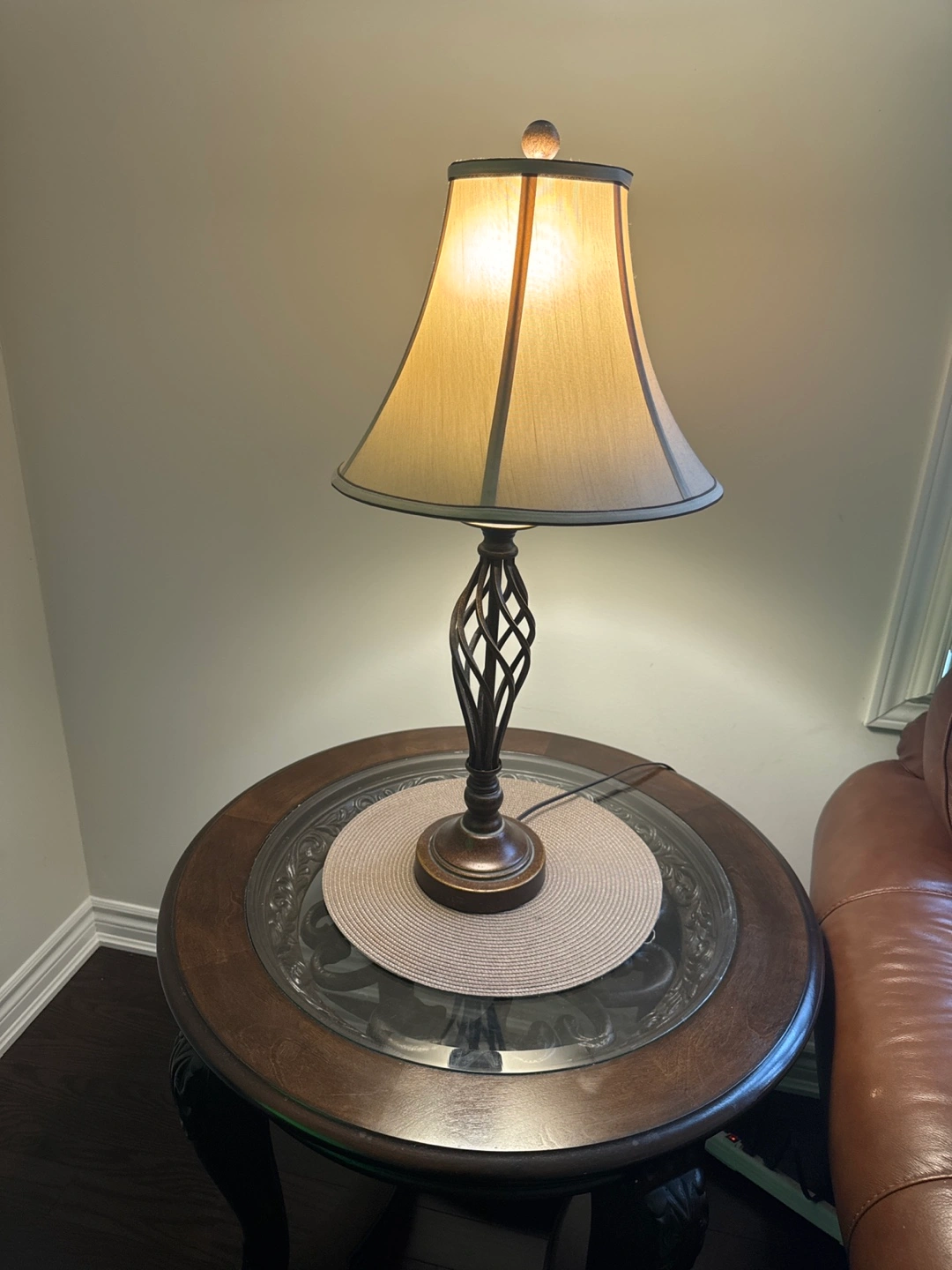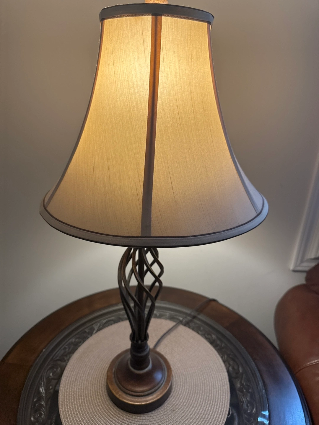10Beautiful table lamp. Features a twisted metal base and a bell-shaped beige lampshade. Perfect for a bedside table or living room. Comes in a pair.