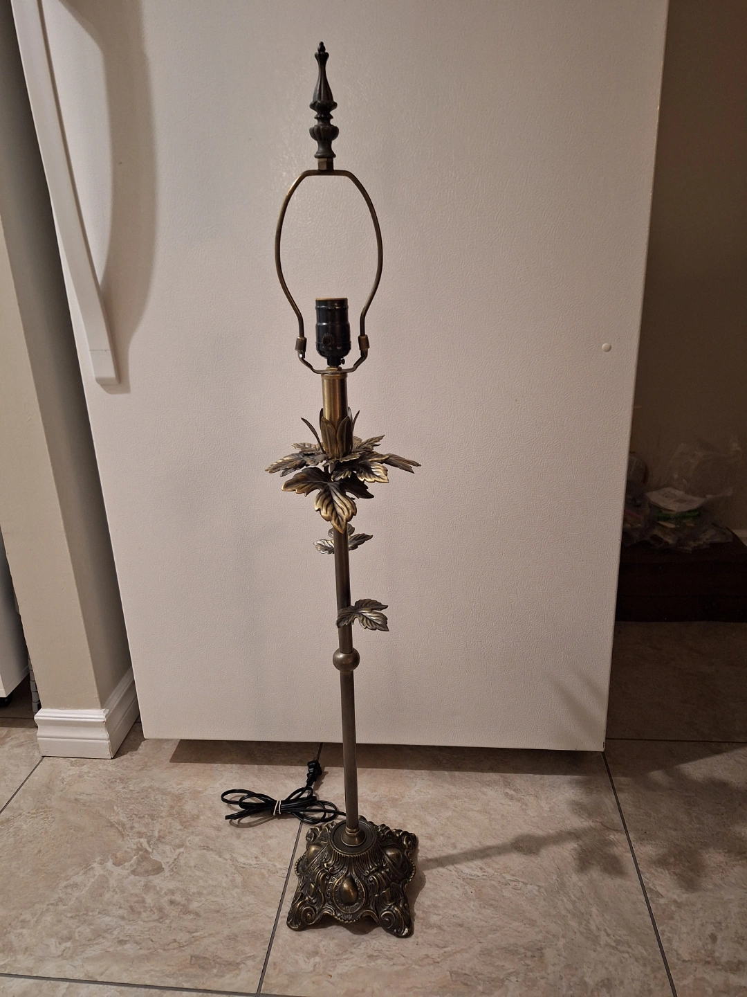 Ornate table lamp features a floral motif. Brass finish. Square base. Great for bedside or living room.