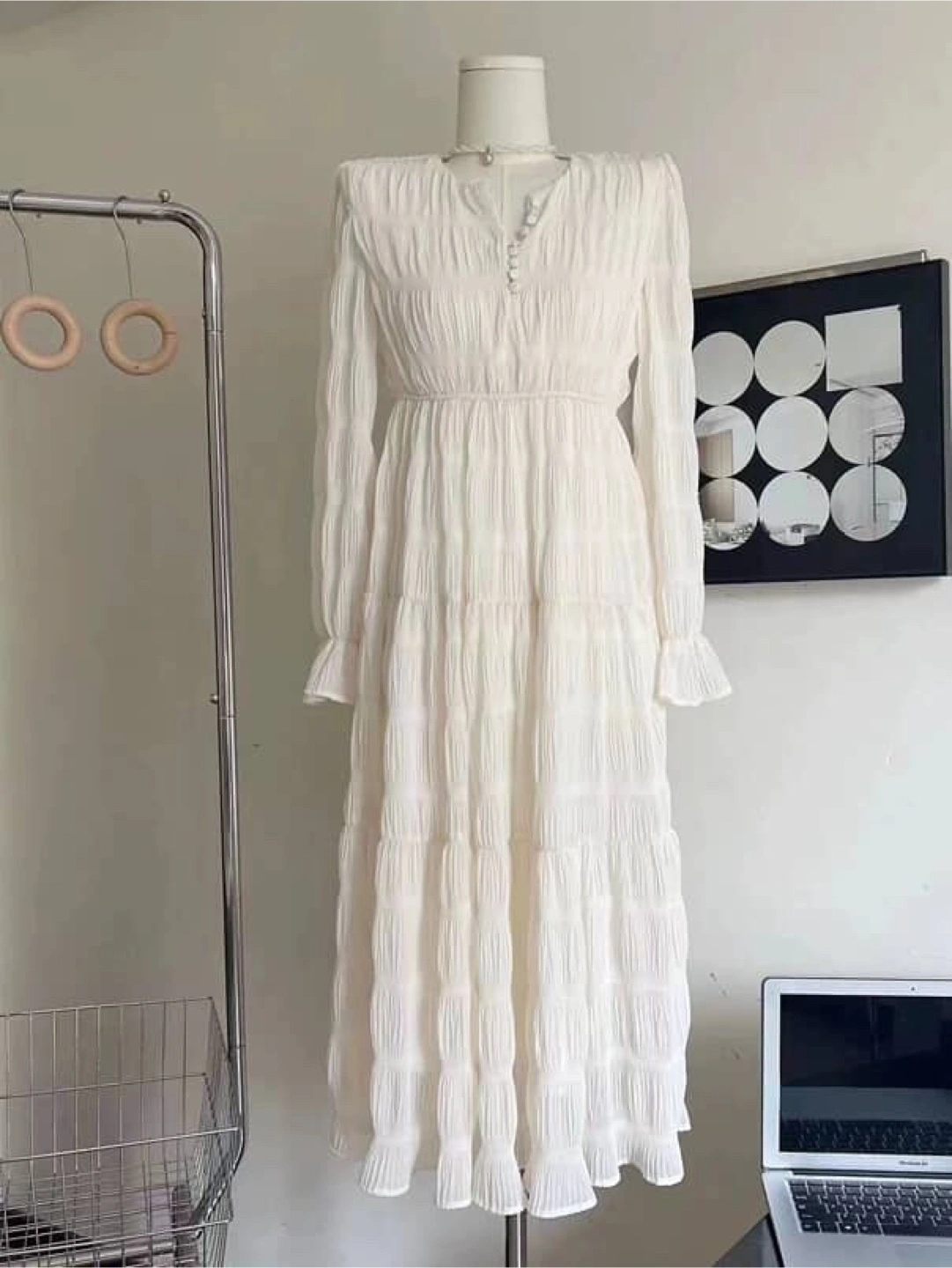 Long-sleeved white maxi dress. Features a V-neckline, button closure, and a tiered design. Puff sleeves and a relaxed fit. Worn 1-2 times