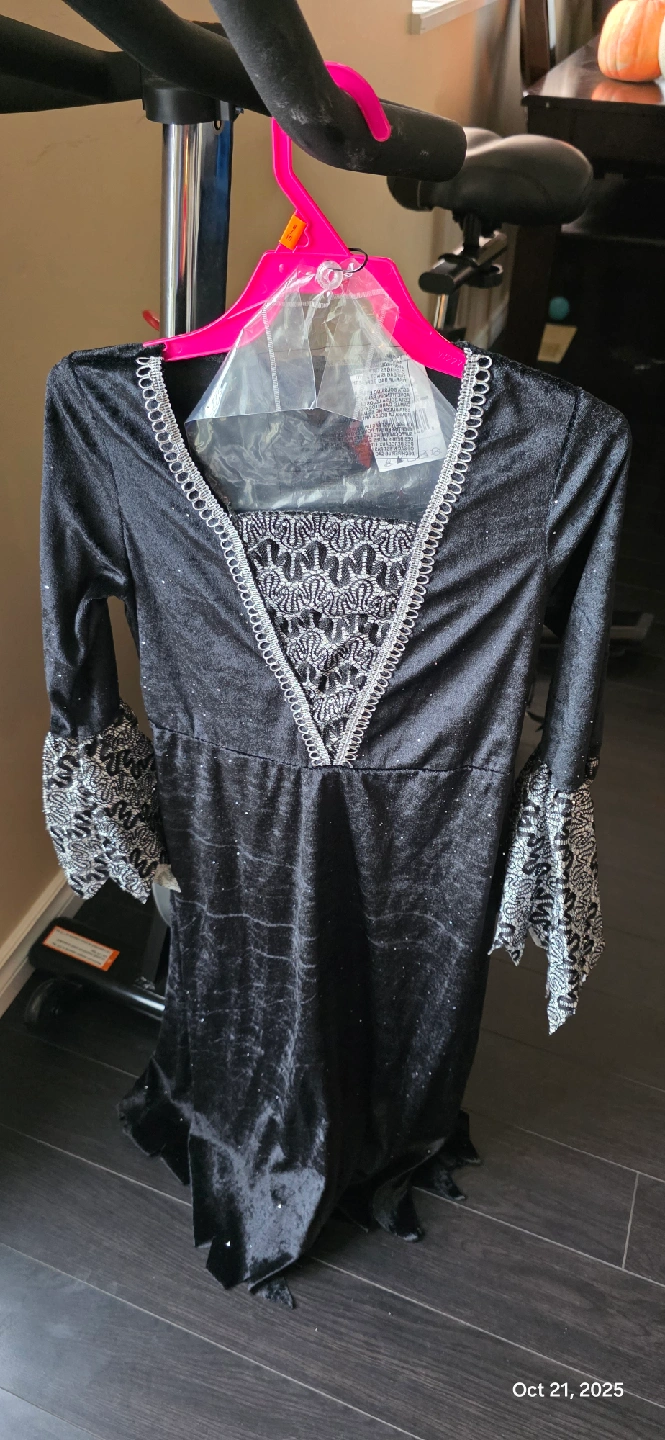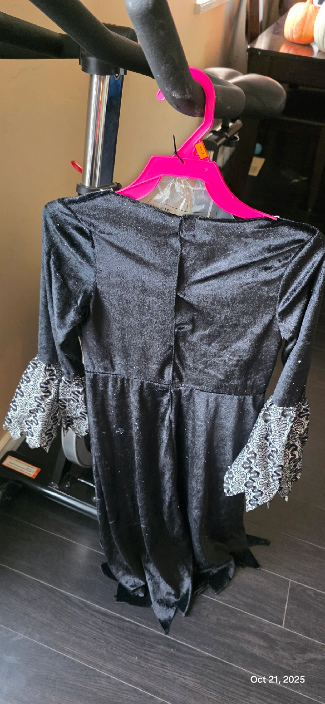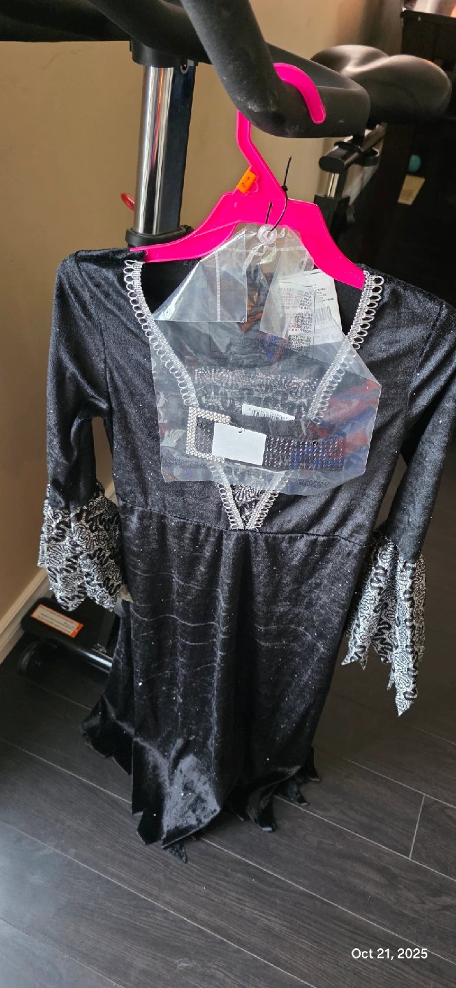 Selling an Elegant Witch costume for girls, size medium (8-10). It includes a dress and hat. Originally bought for $24.98