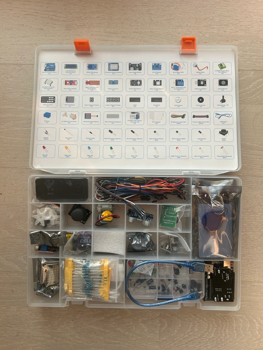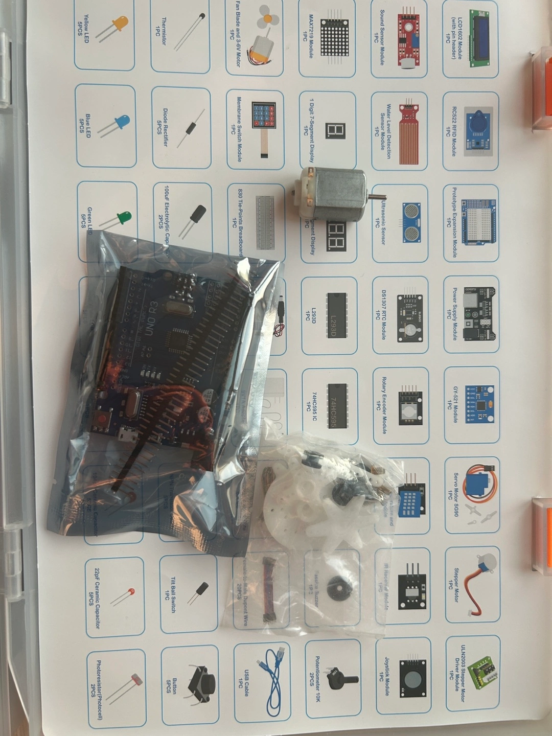 70A comprehensive starter kit. Includes various electronic components and modules. Great for learning about electronics and programming in a relaxing environment. Includes extra UNO R3 Controller Board, 3-6V motor, and additional servo motor arms. Does not include fan blade and water level detection module.