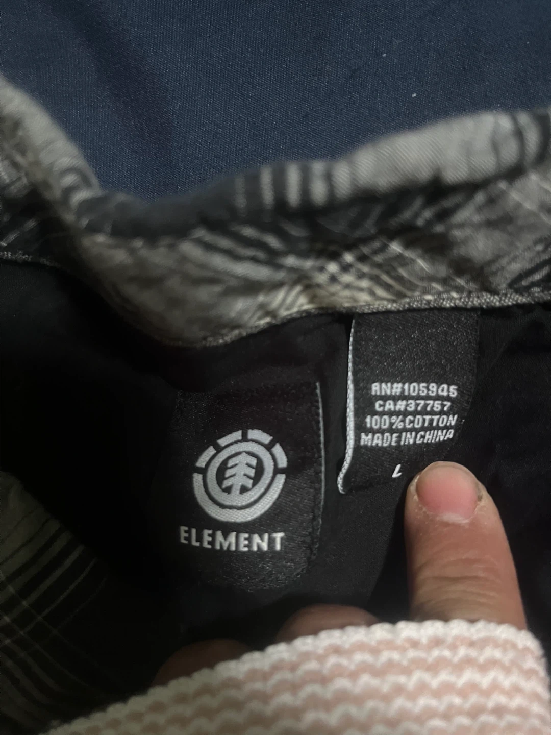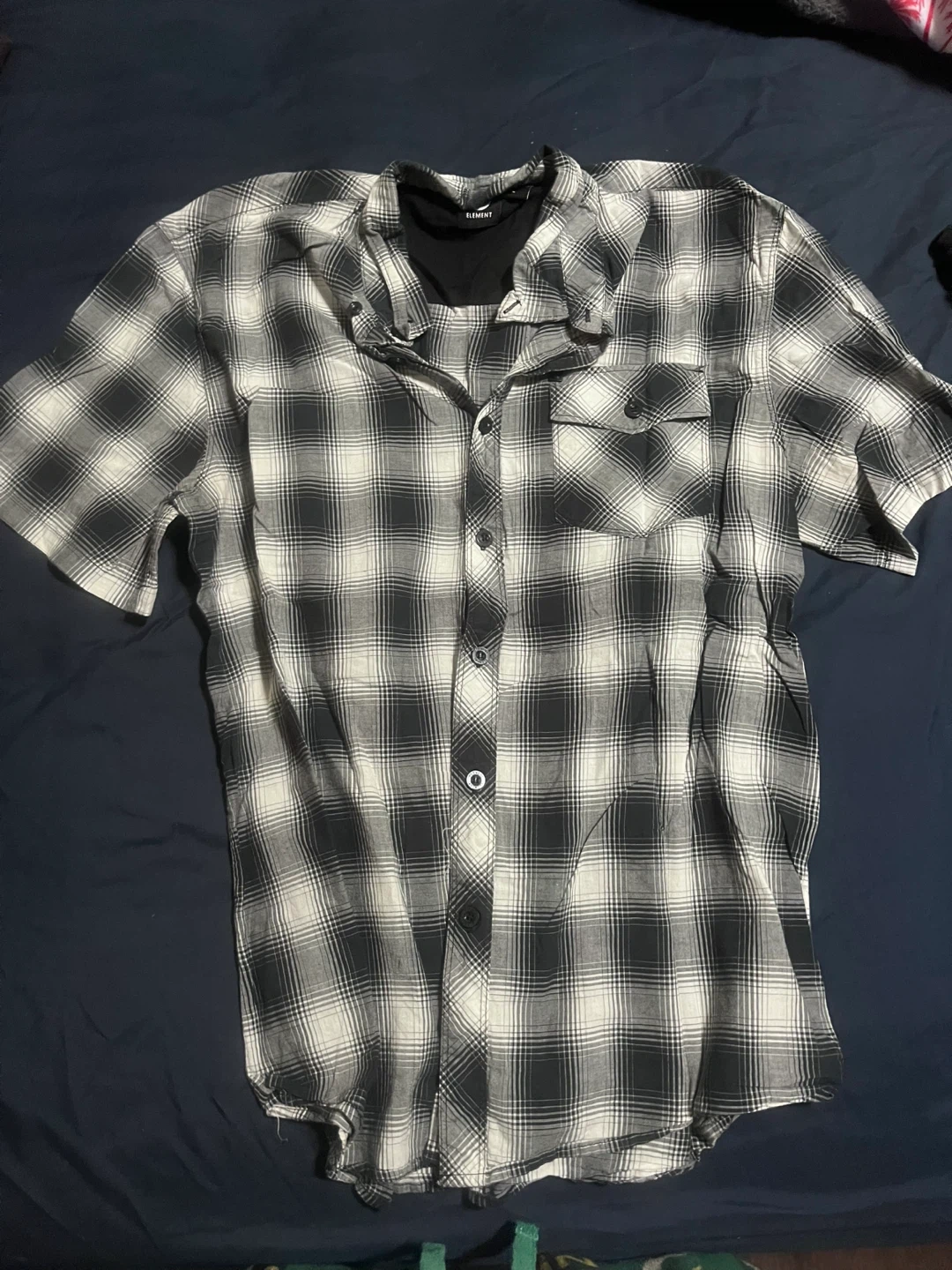 Selling a gently used Element plaid button-up shirt in size L. It's made from 100% cotton and has a classic black and white pattern. Perfect for casual wear! $10
