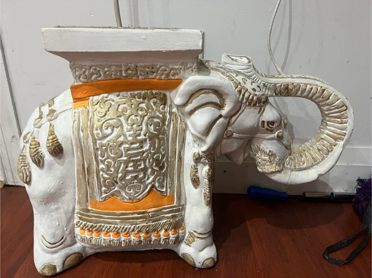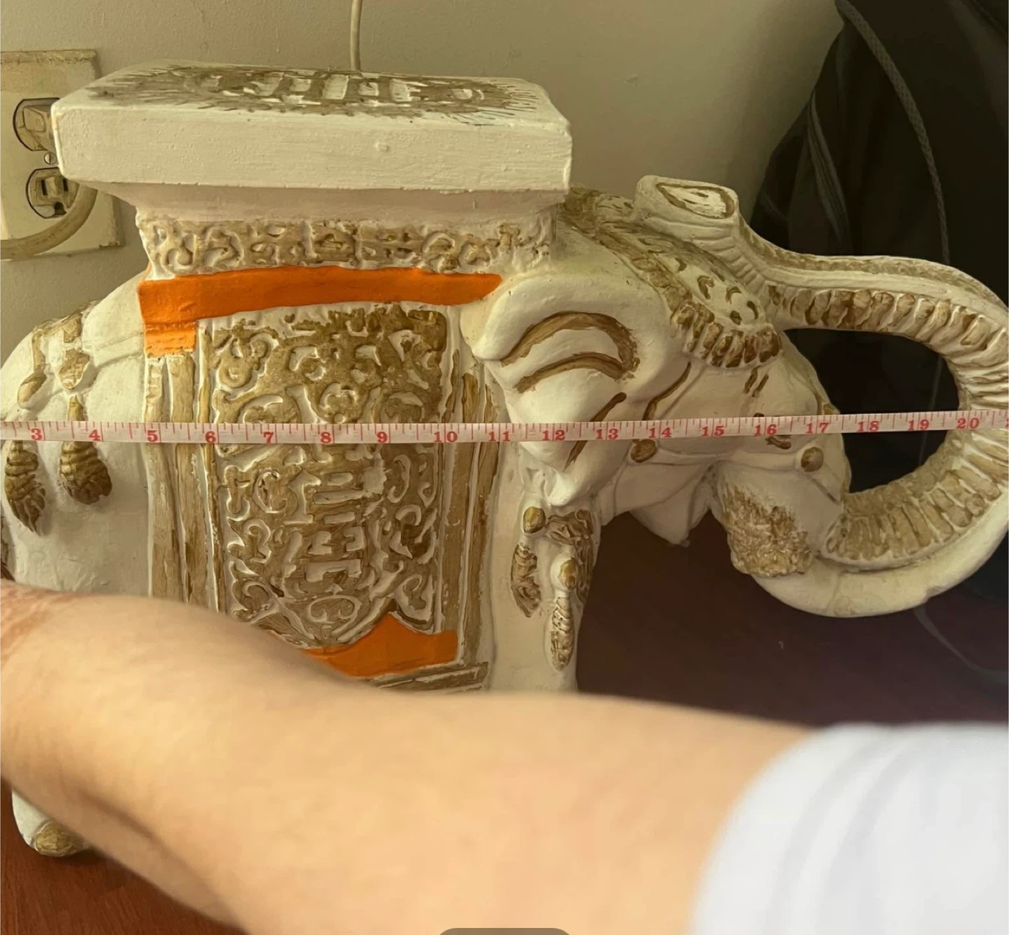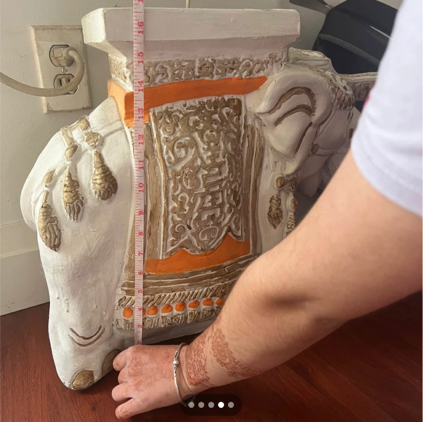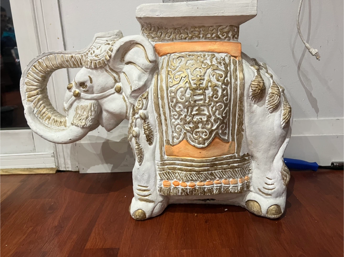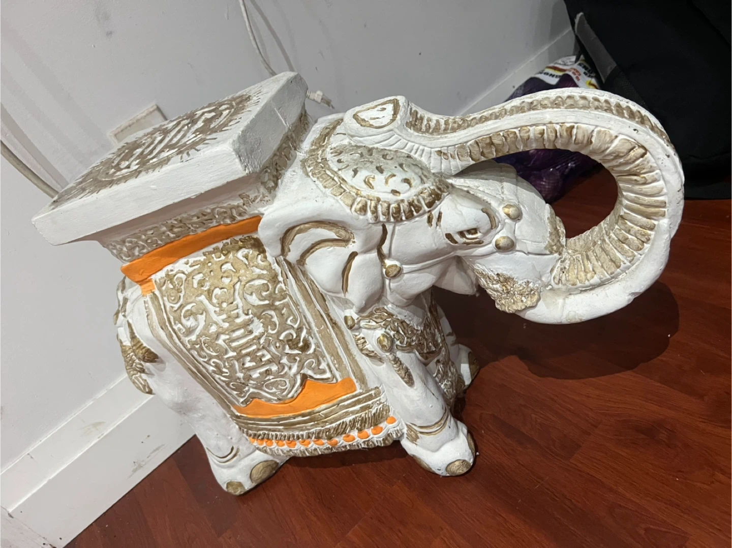10Selling a decorative elephant statue. It's white with gold accents and some orange detailing. It measures approximately 16 inches in height and 20 inches in length, making it a unique and eye-catching piece for any room