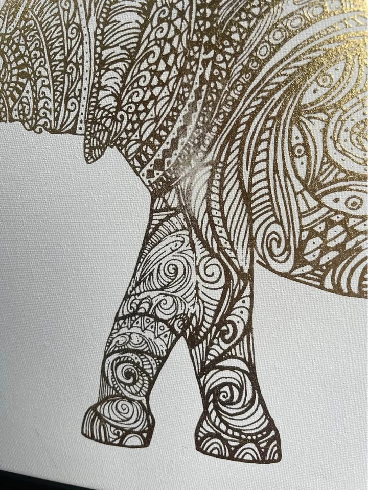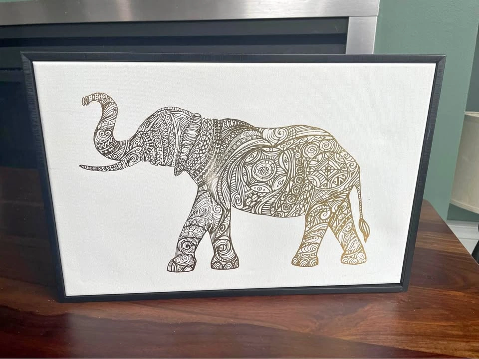 Very pretty metallic golden print elephant home deco. Small color fade as shown in picture but not really noticeable unless looking carefully at it. 14.5x9.5 inches. Pick up in North Van by Lonsdale Quay.