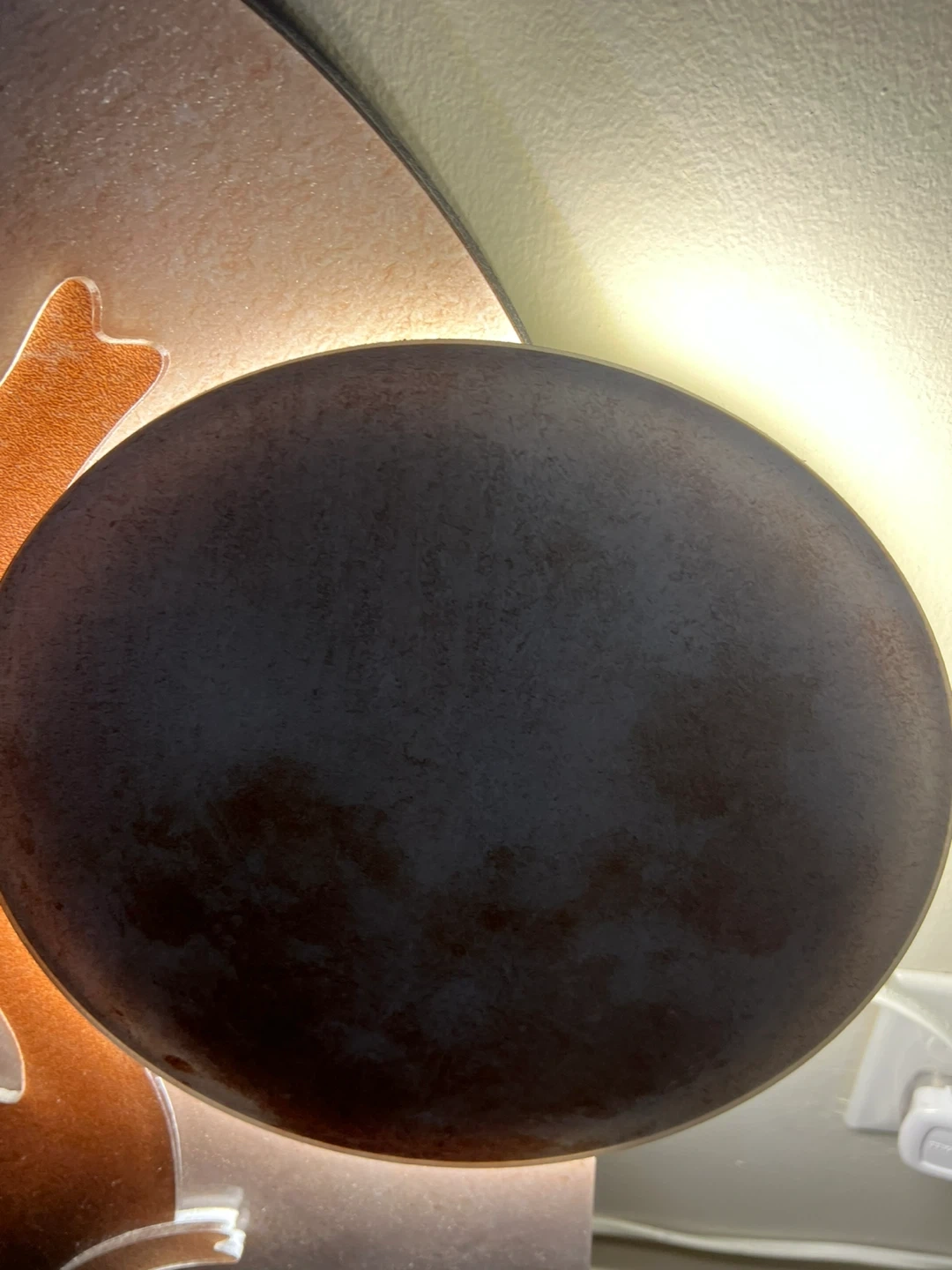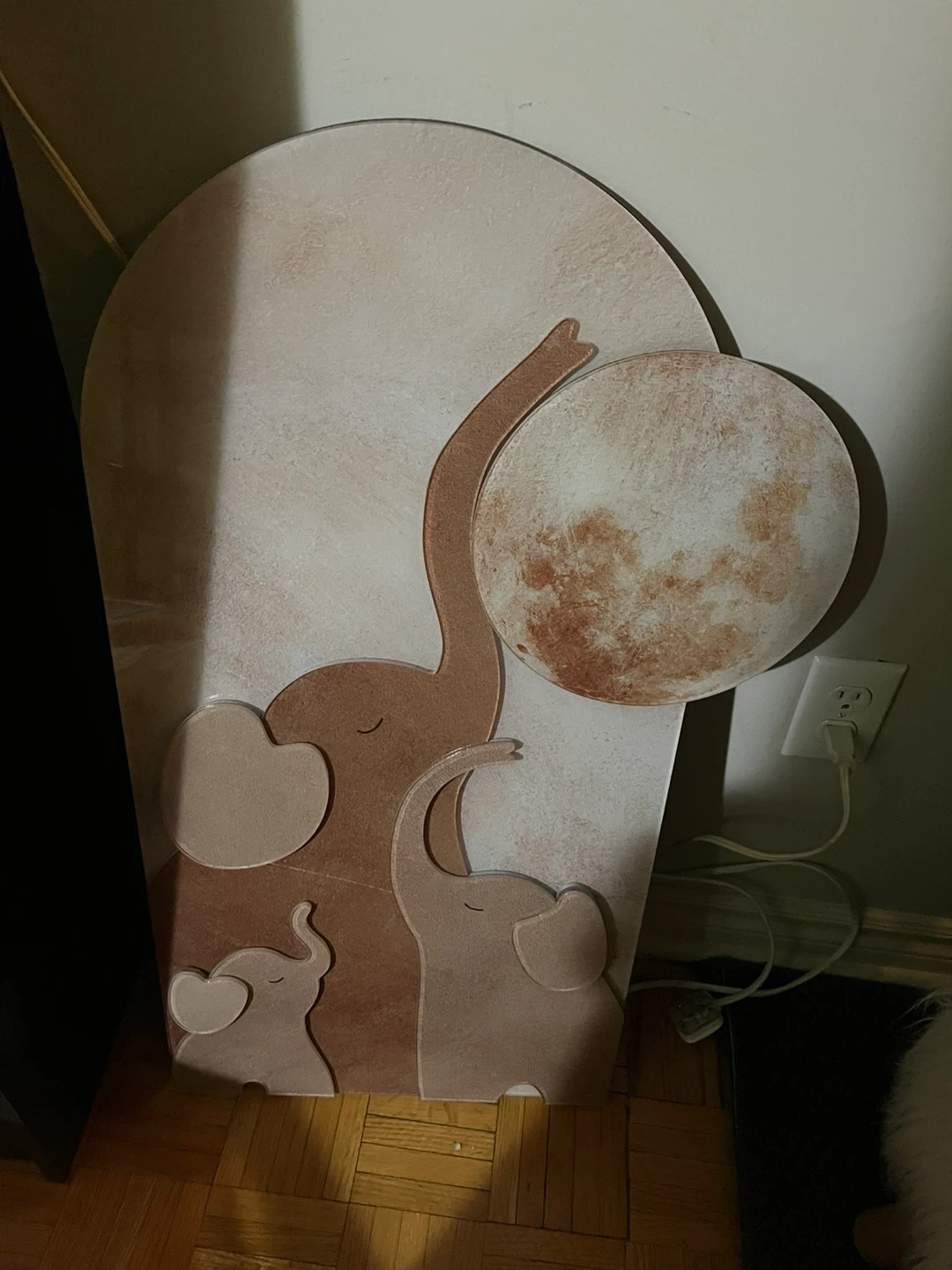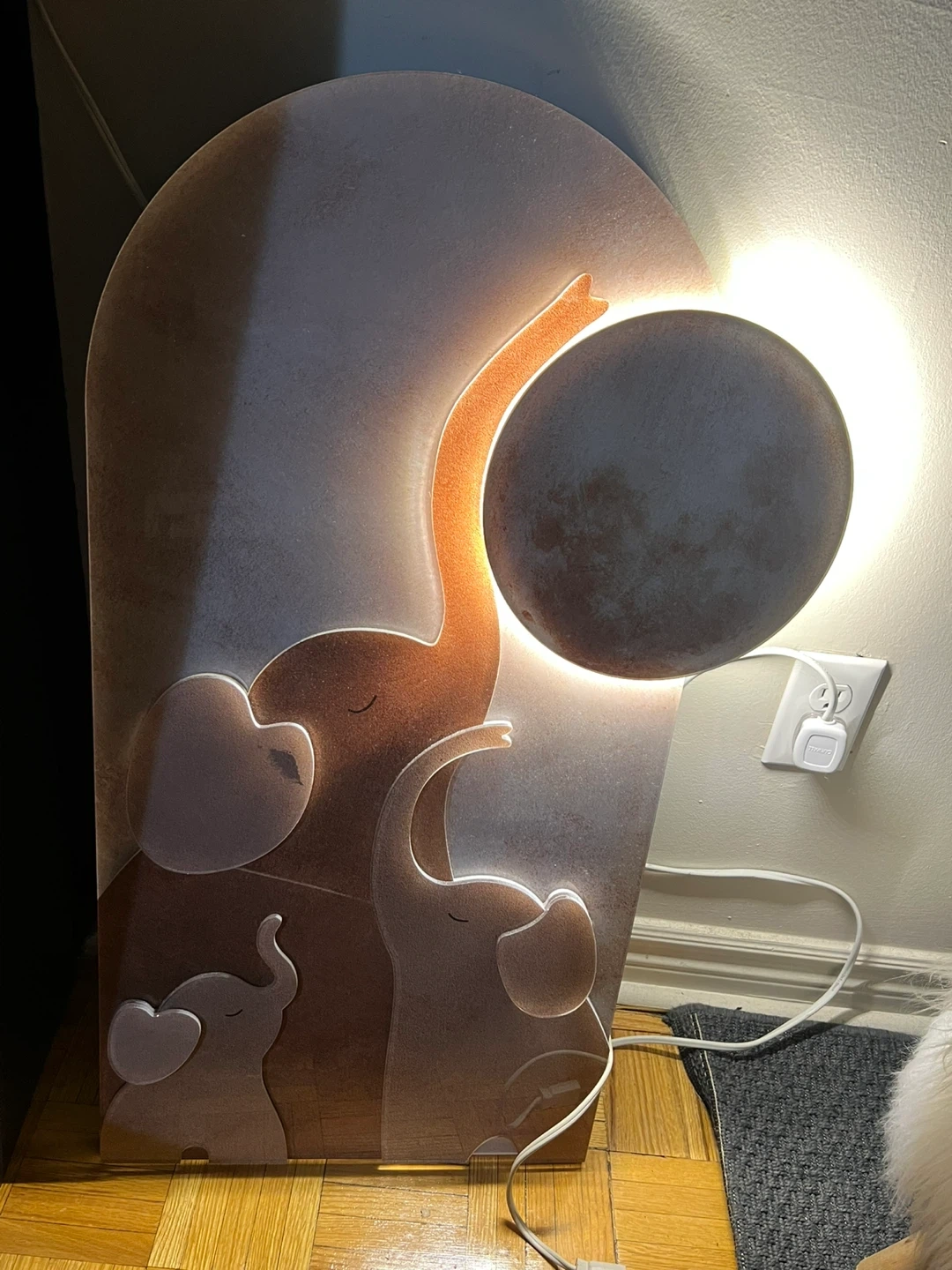 94This is a lovely elephant family night light. It has a soft glow and would be perfect for a nursery or child's room! The design features an elephant family under a moon. It's in great condition and ready to bring a warm ambiance to your home