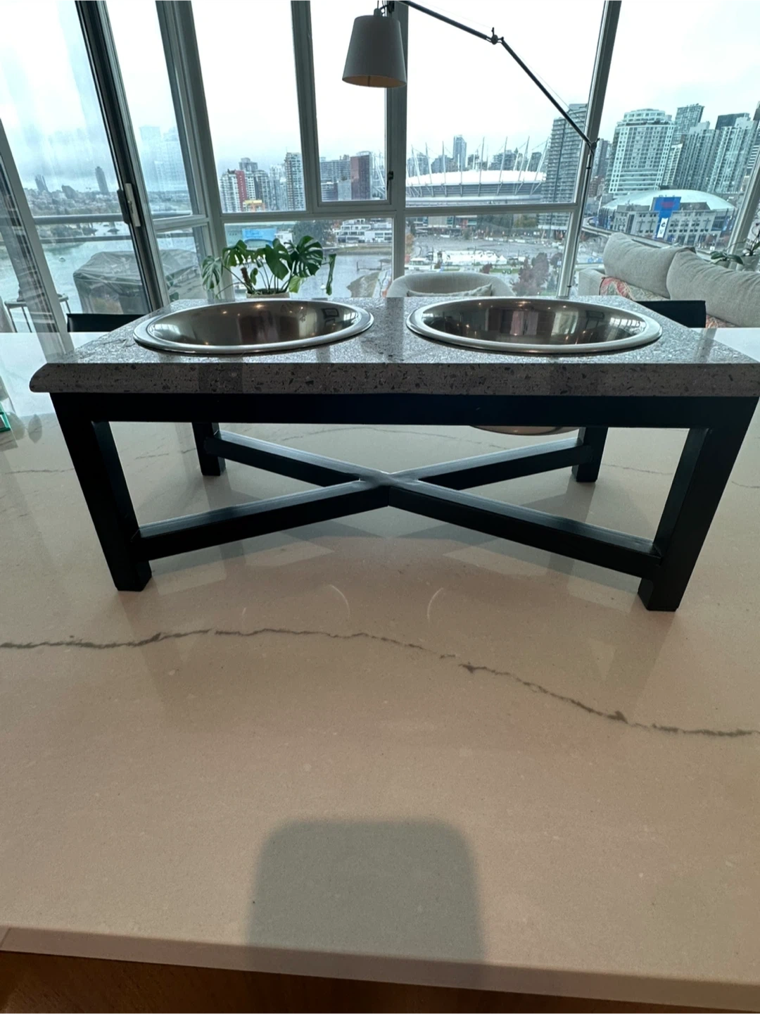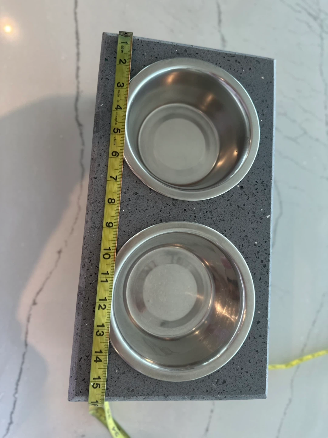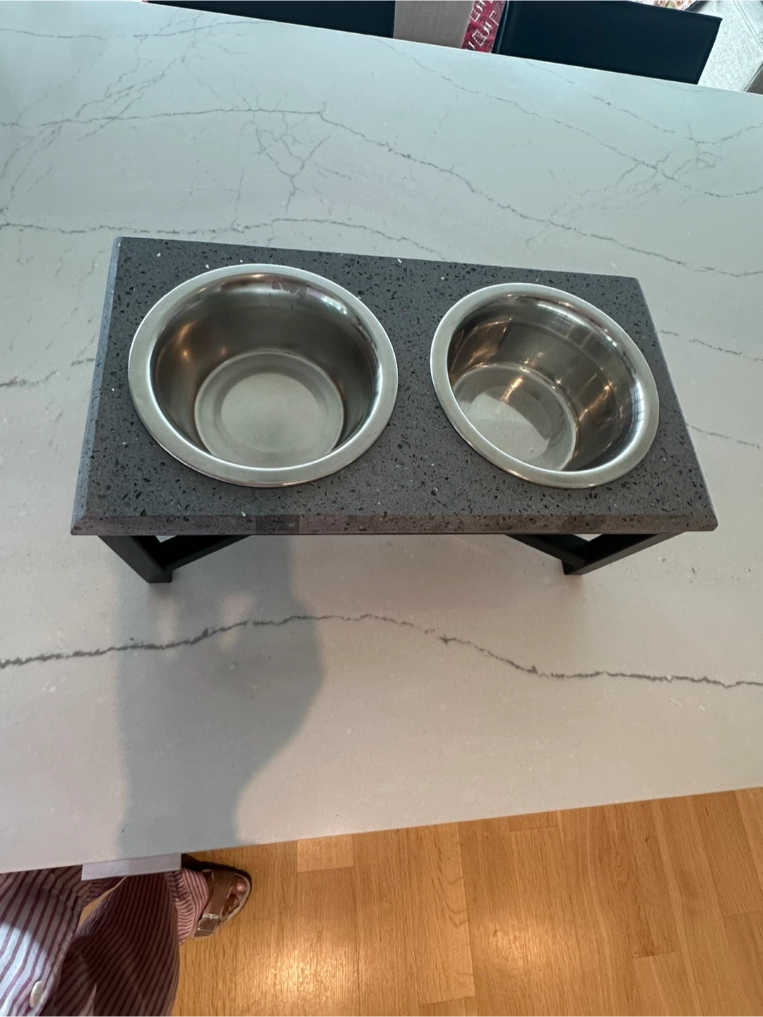 Selling a double dog bowl stand with stainless steel bowls. The stand is elevated for your pet's comfort. It measures approximately 15 inches long and 8 inches tall. Great for keeping your pet's feeding area tidy!