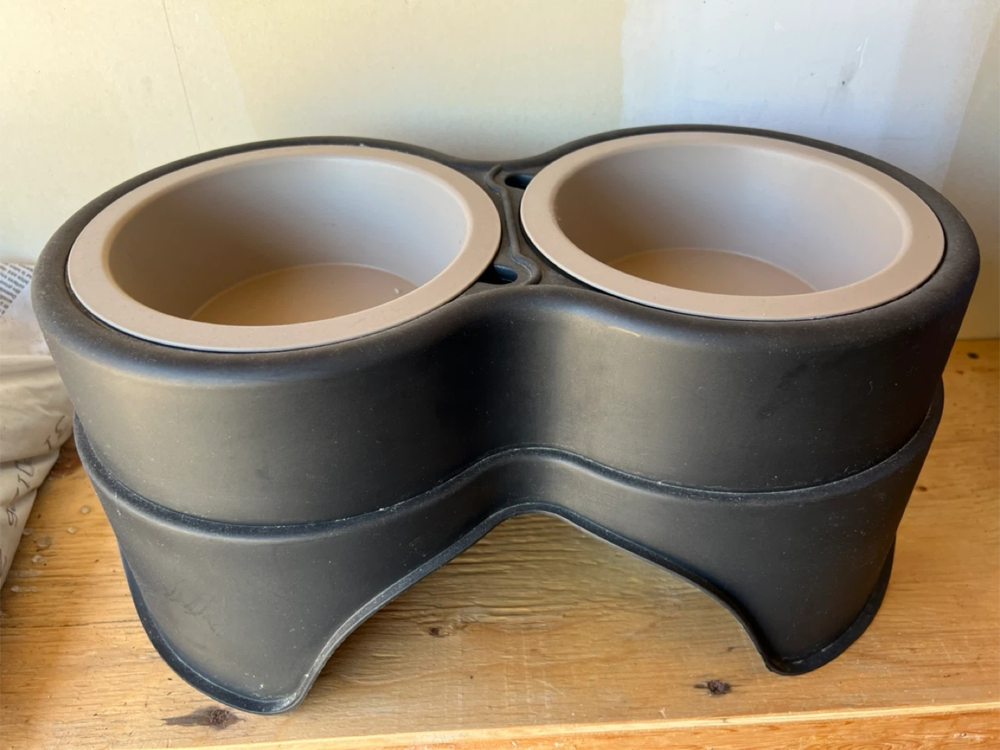 Selling a used elevated double pet bowl in black. It's in good condition and perfect for keeping your furry friend's food and water off the floor!
