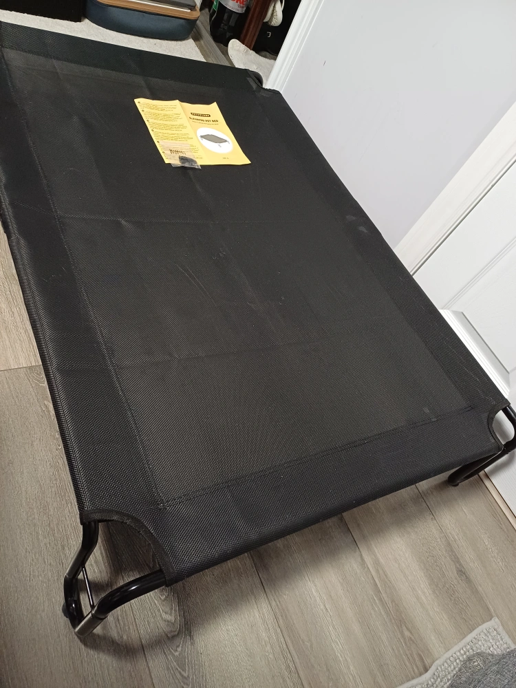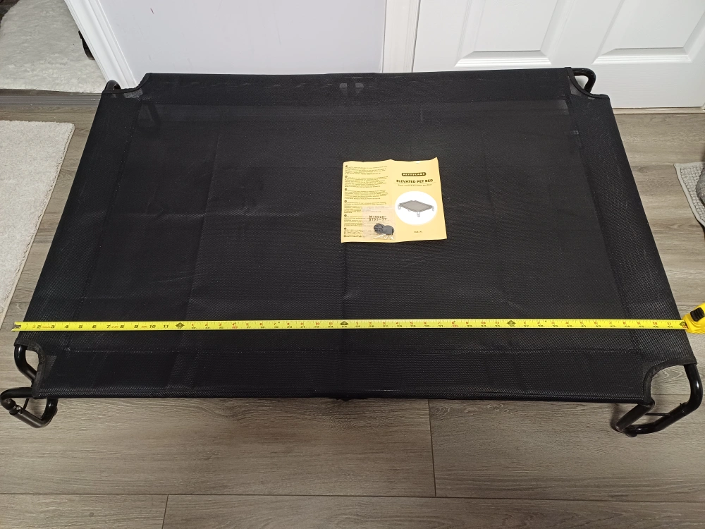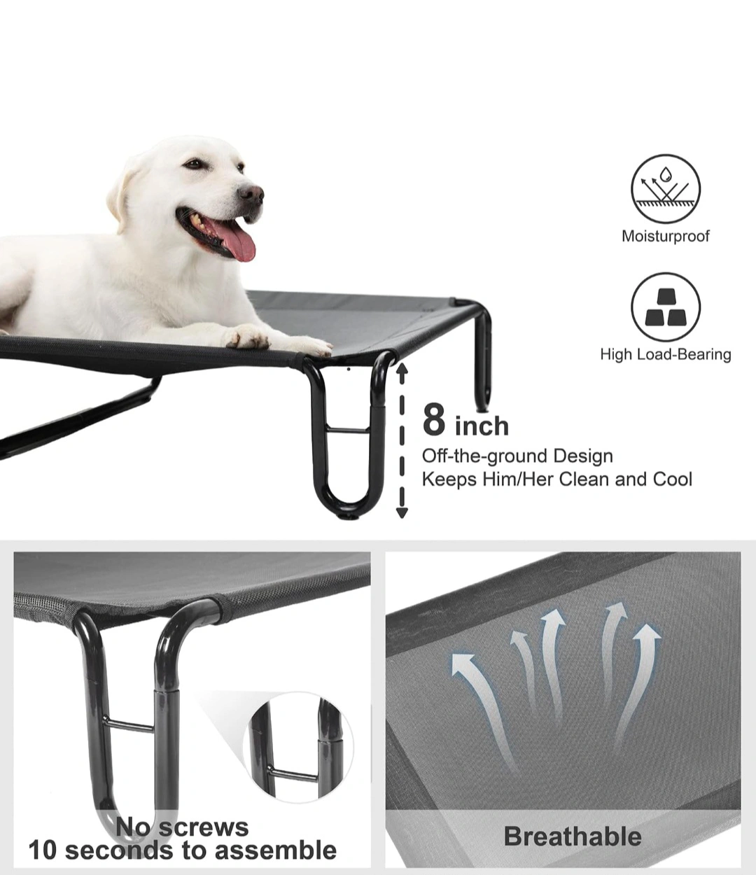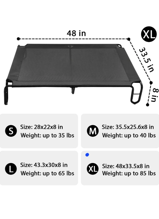 Brand New... Never used.... Pettycare...Black elevated pet bed Extra large size. Water proof raised dog bed, cooling elevated bed with teslin mesh..Durable..Non-slip... Measuring 48 inches lonh, 33.5 inches wide and 8 inches in height. Can carry upto 85lbs. Great for dogs who prefer to sleep off the ground. Durable, easy to clean. Easy to assemble