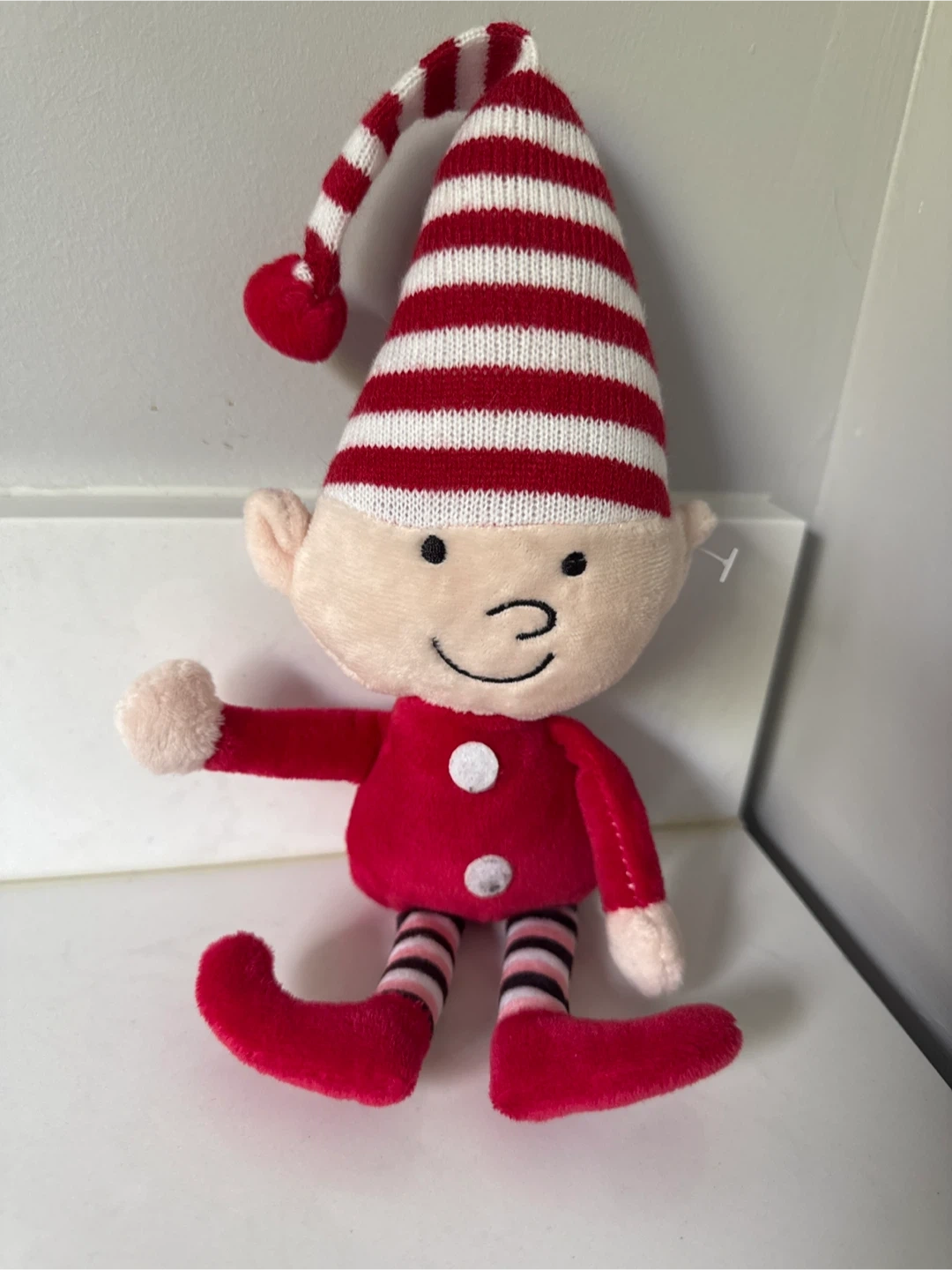 A cute elf plush toy, perfect for the holidays! It features a red and white striped hat and a red outfit. It's in good condition and ready to bring some cheer to your home