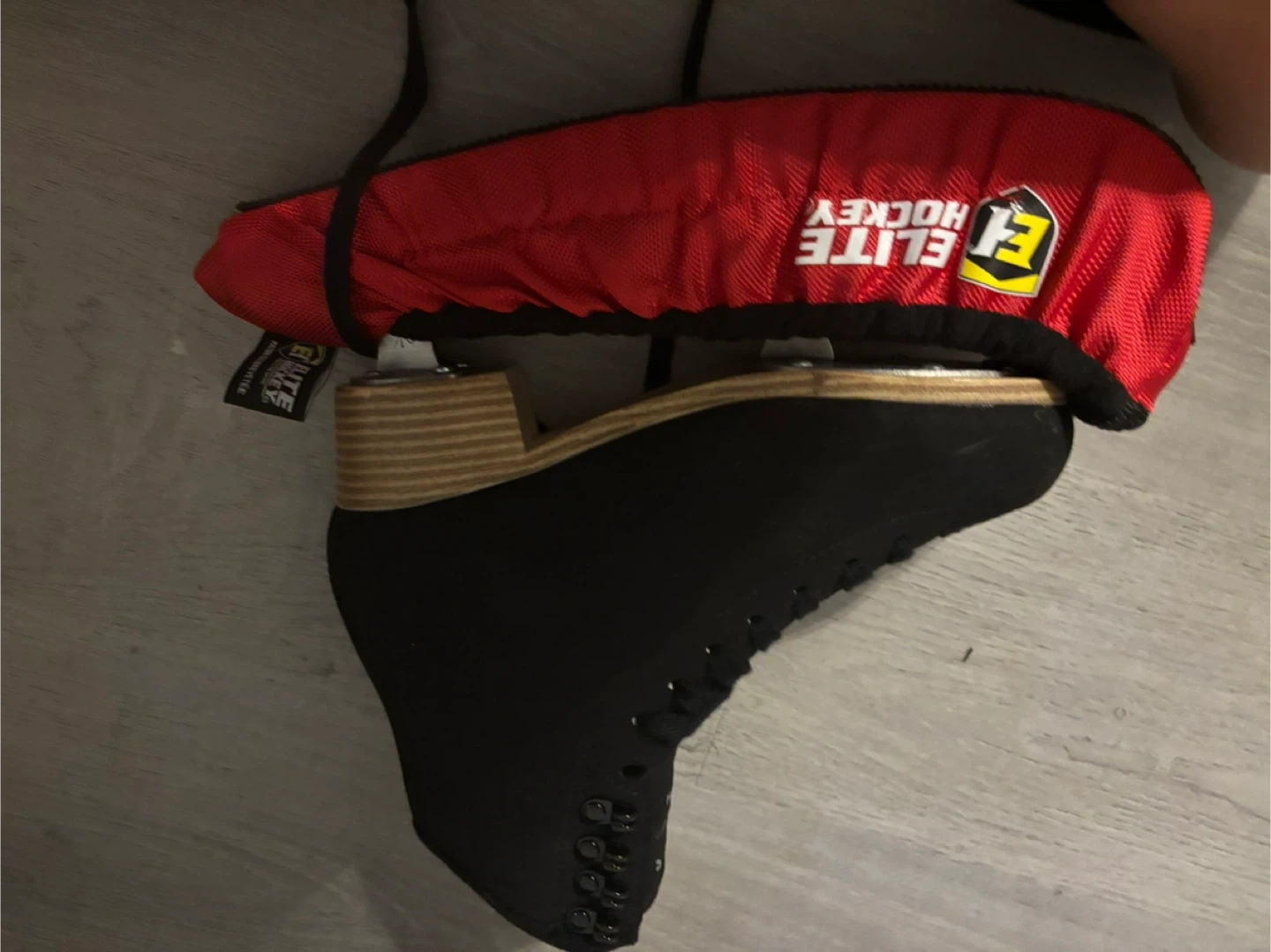 60Selling a pair of Elite Hockey figure skates in black. They come with red Elite Hockey blade covers. Ready for the rink!