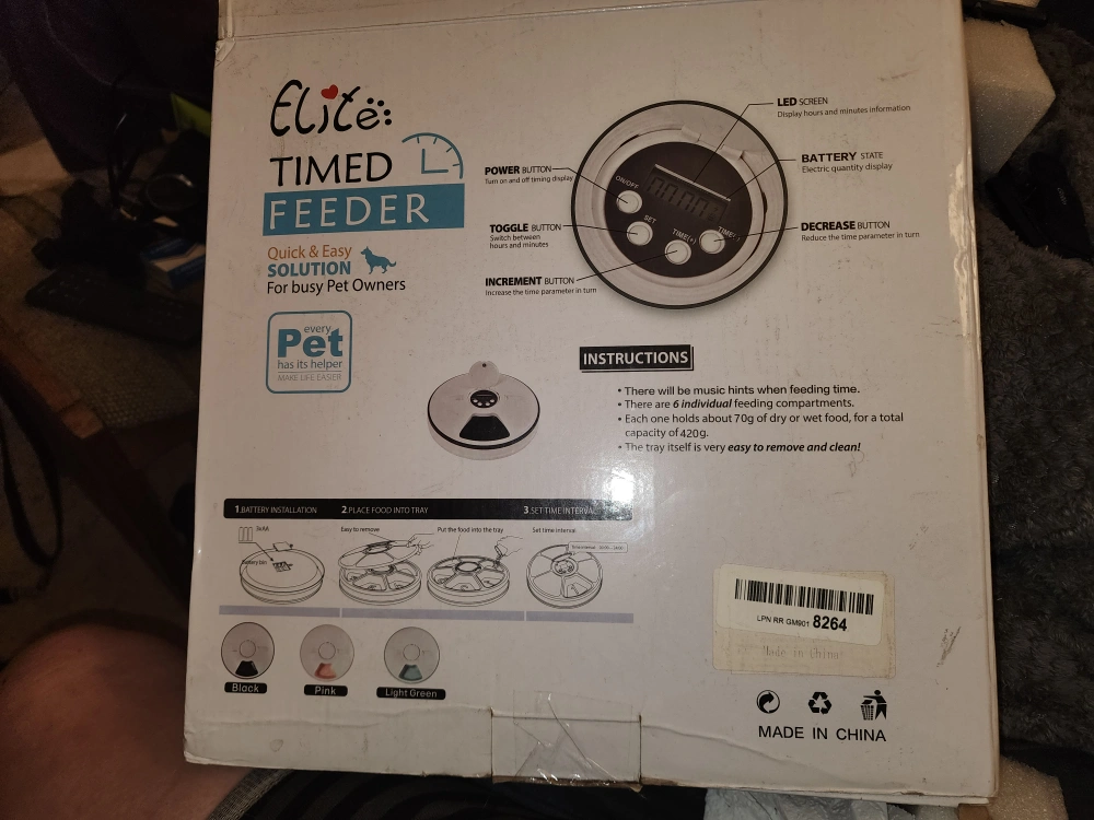 Selling an Elite Timed Feeder, perfect for busy pet owners! It's a quick and easy solution to ensure your furry friends are fed on time. The feeder has 6 individual feeding compartments, and each tray can hold about 70g of dry or wet food, for a total capacity of 420g. The tray itself is very easy to remove and clean, making maintenance a breeze