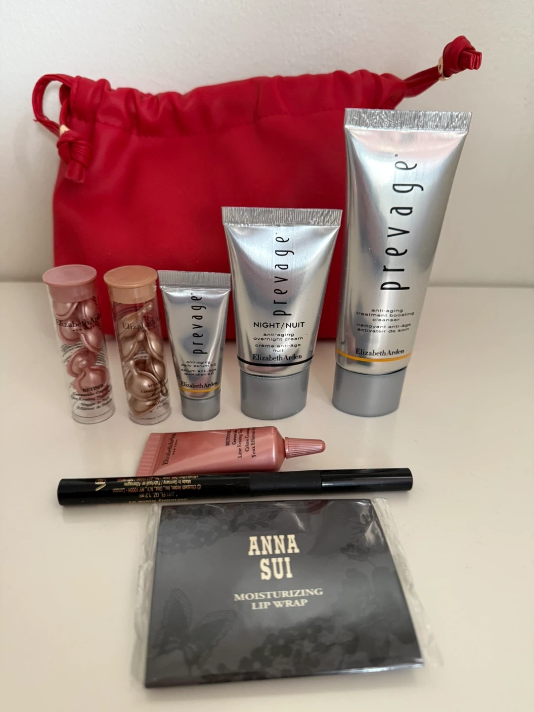 102Selling a skincare set that includes Elizabeth Arden and Prevage products. The set includes: - Elizabeth Arden Retinol Ceramide Line Erasing Eye Cream - Prevage Anti-aging Treatment Boosting Cleanser - Prevage Night Anti-aging Overnight Cream - Elizabeth Arden Ceramide Capsules - Anna Sui Moisturizing Lip Wrap