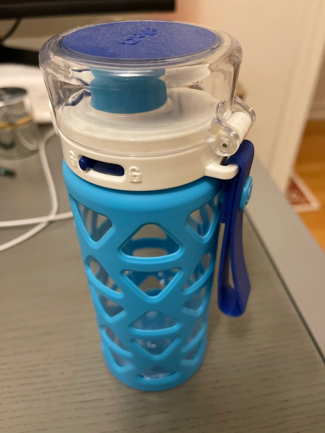 37Ello AUTOSEAL water bottle. Features a clear glass bottle, silicone sleeve, and a leakproof lid. Carry loop included. Only available for pick up.