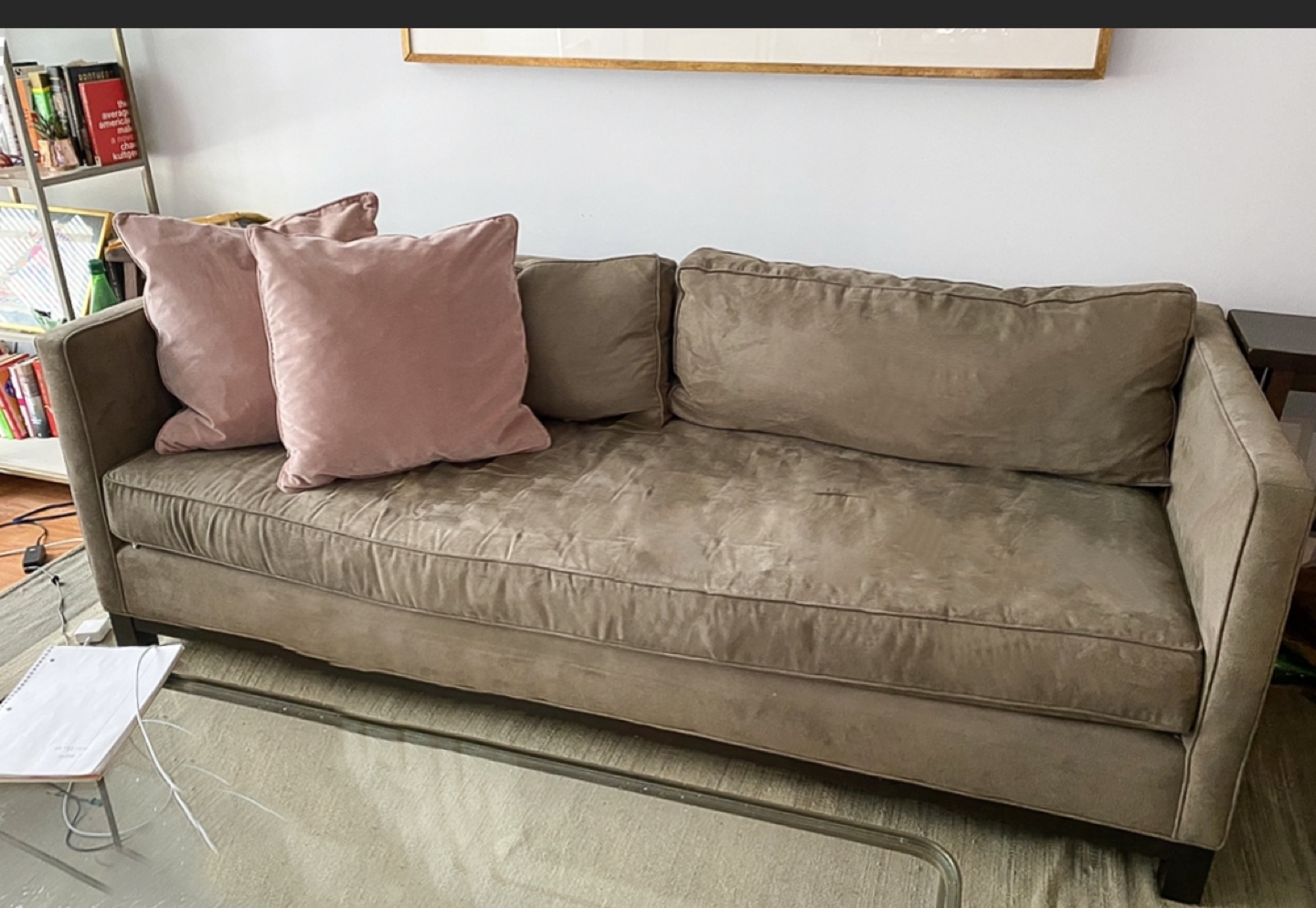 1585” bench sofa with two back cushions and welted sidearms. Asking 800 OBO. Upholstered in Graphite Velvet and naturally water resistant for excellent durability. The color changes depending on the light, with a base in Java wood. The softest and comfiest sofa I have ever owned, purchased from MGBW Atlanta in 2017 for 4300 USD, and this model retails for about 5300 at Elte in Toronto. Need to make room in a tinier house, so sadly this sofa has to go ASAP. Must be able to pick up in the East end of Toronto. The pink velvet pillows in the first photo are not included, but are from Article. If interested in bundling items for a discounted price, please see my other listing https://ca.karrotmarket.com/articles/120368?inviter_id=73757 The smaller red velvet pillows are also available separately with best offer.