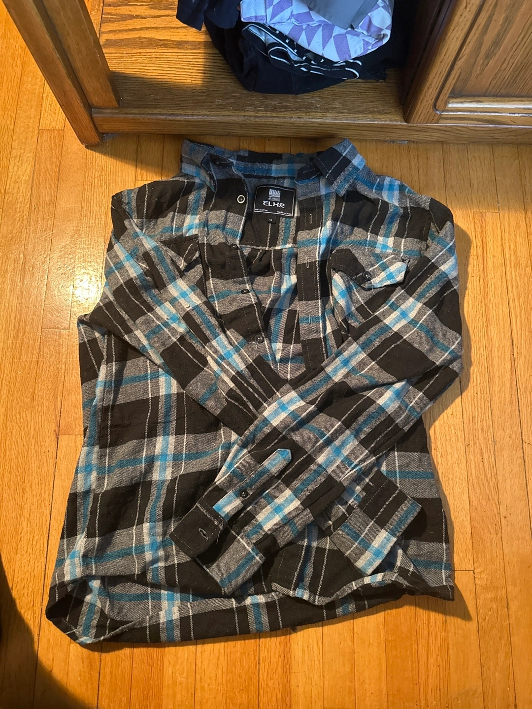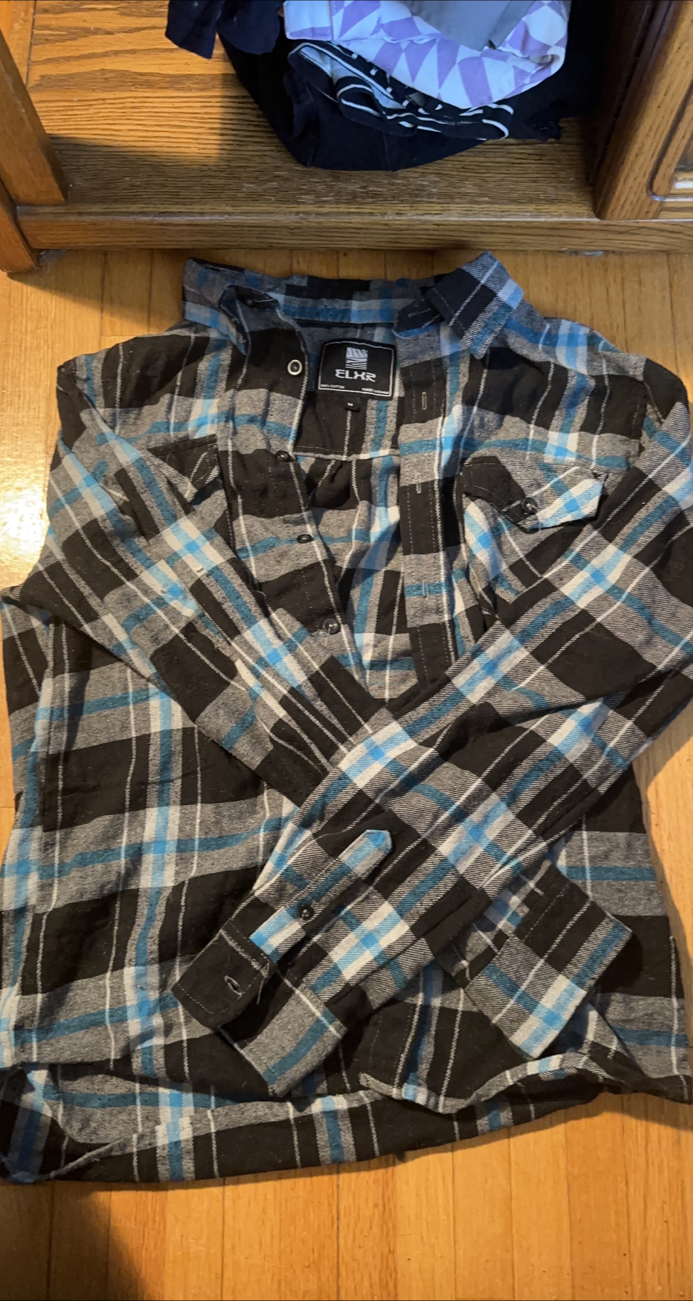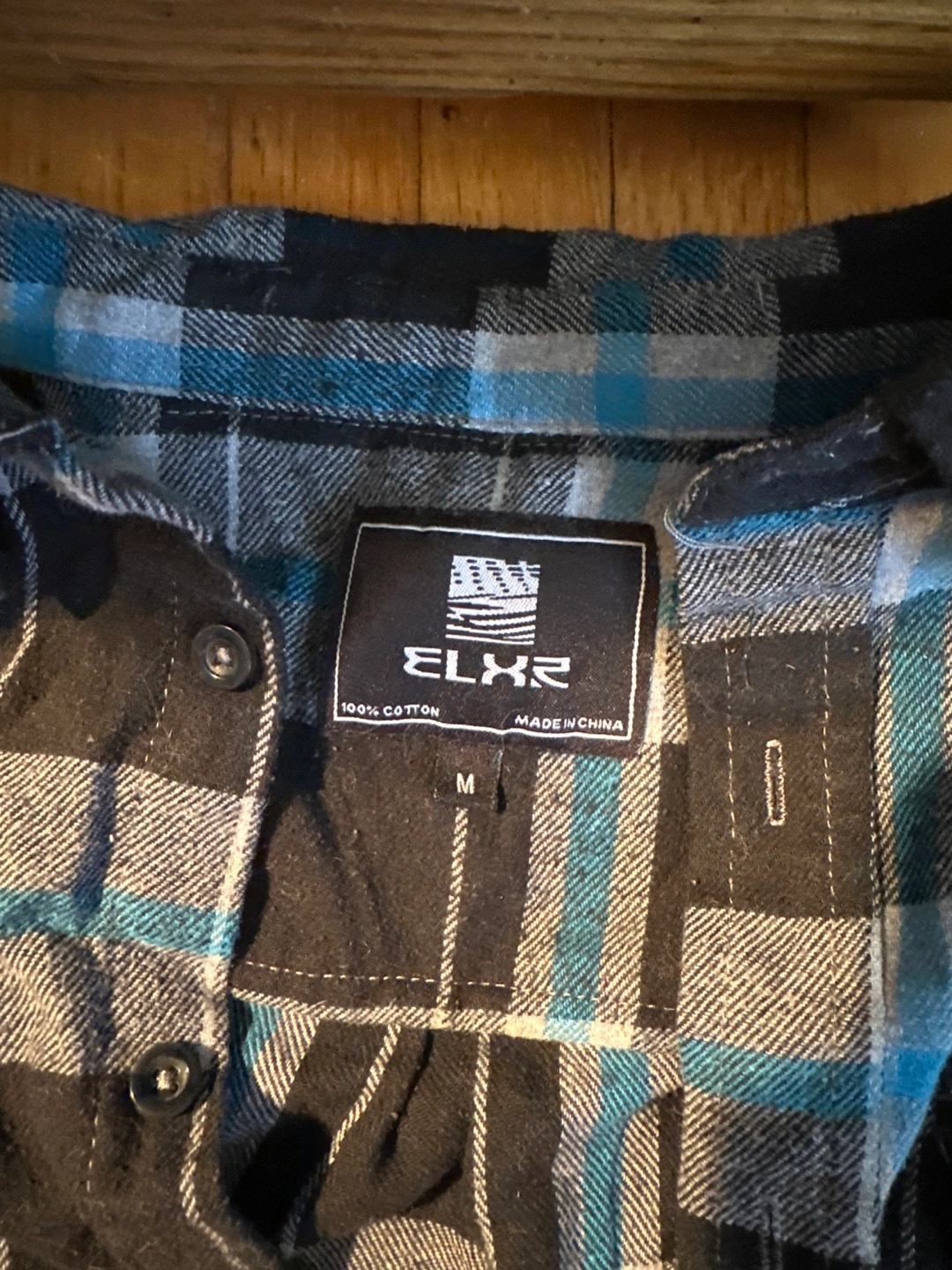Cozy ELXR flannel shirt in a classic plaid pattern! It's a size medium and made of 100% cotton, perfect for layering or wearing on its own. The colours are a mix of black, grey, and blue. It's in great condition and ready for a new home