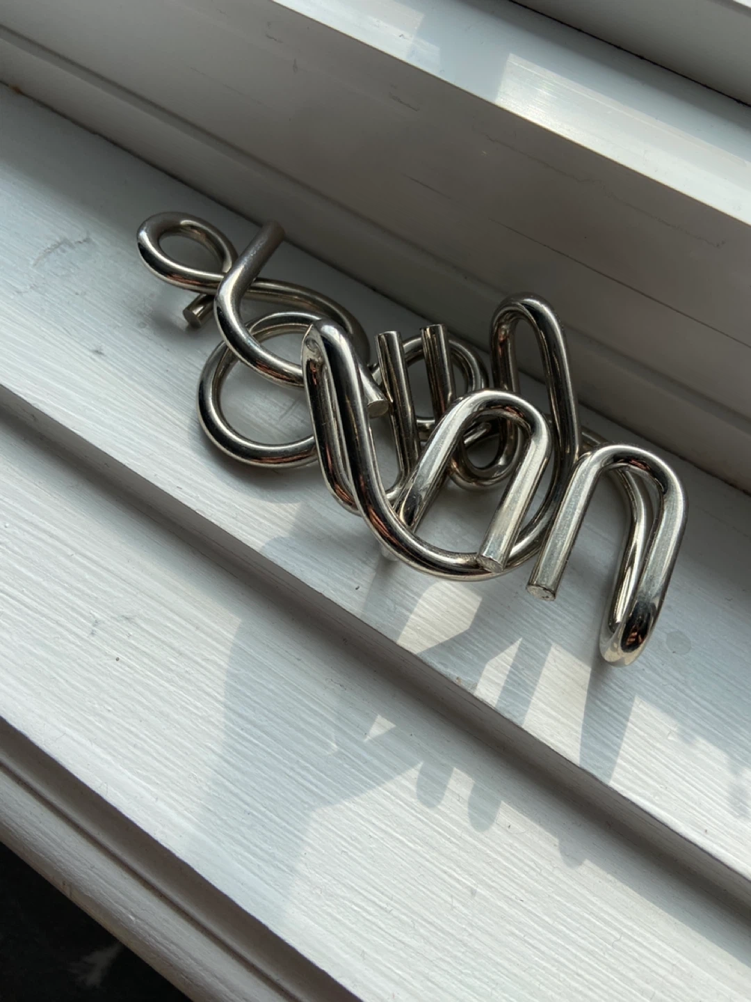 A challenging metal disentanglement puzzle. It's made of shiny, durable metal and comes in a single piece. This brain teaser is great for developing problem-solving skills. It's a fun challenge for adults and older kids!