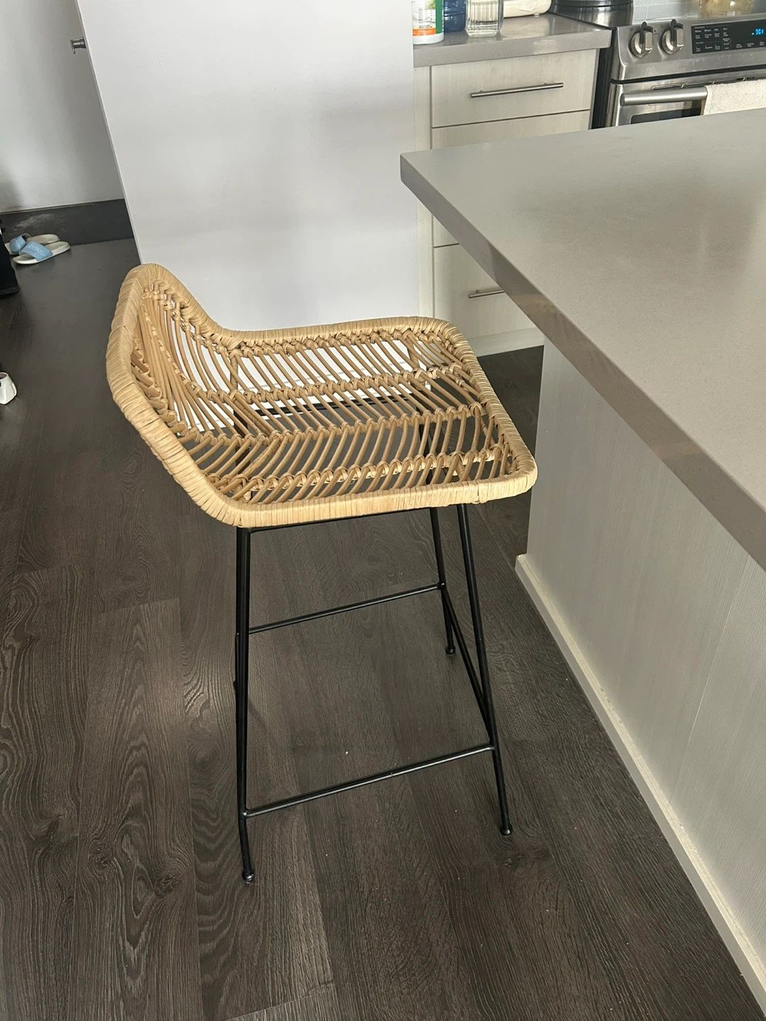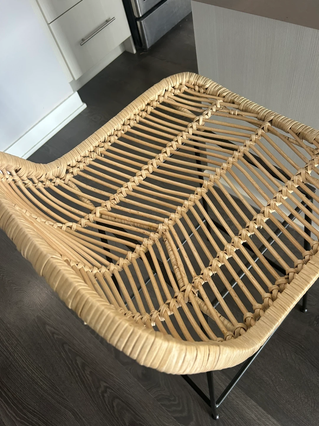 Moving sale!! This bar stool features a natural rattan woven seat and back. It's supported by sleek black metal legs. Definitely a stylish addition for any kitchen island!