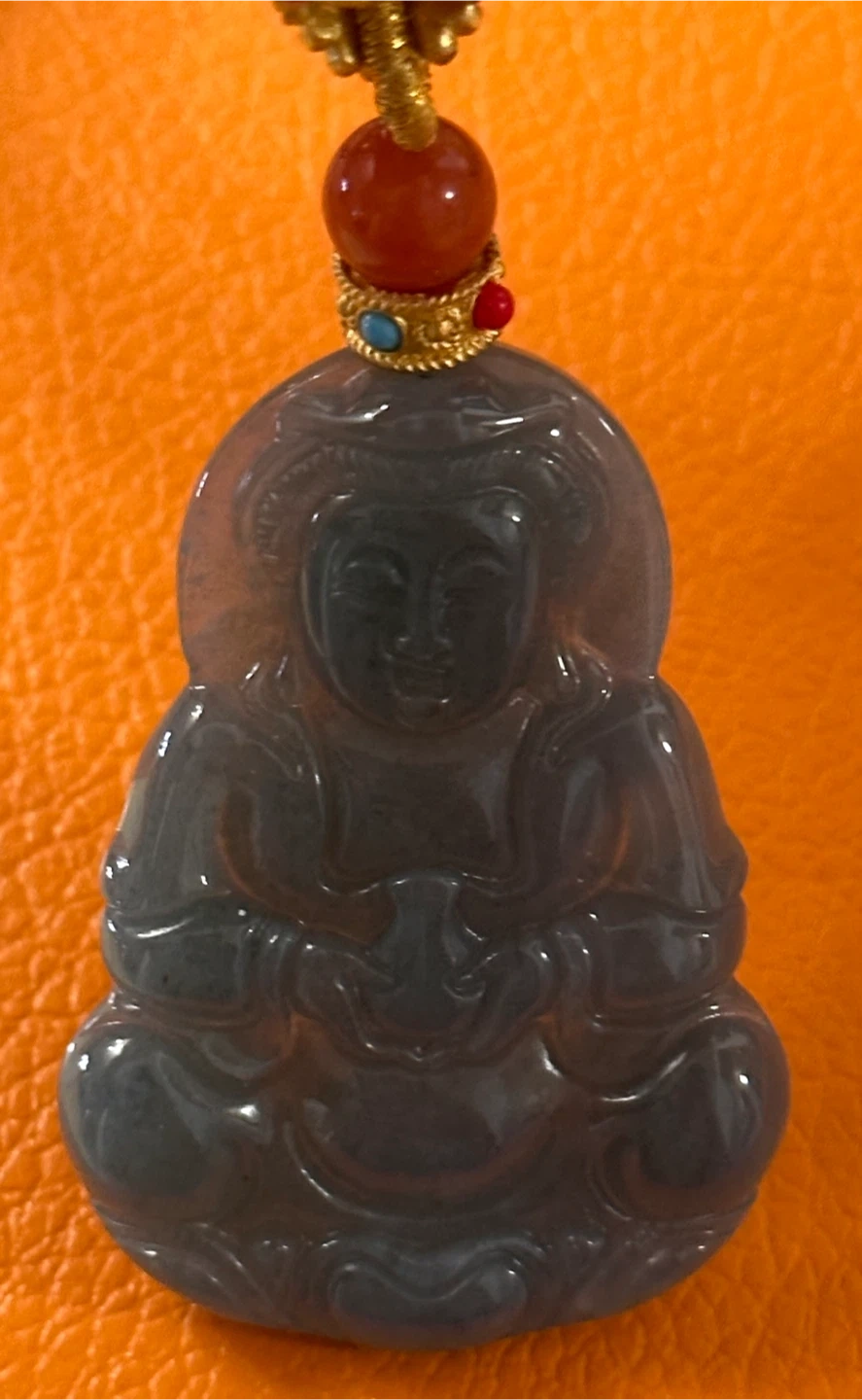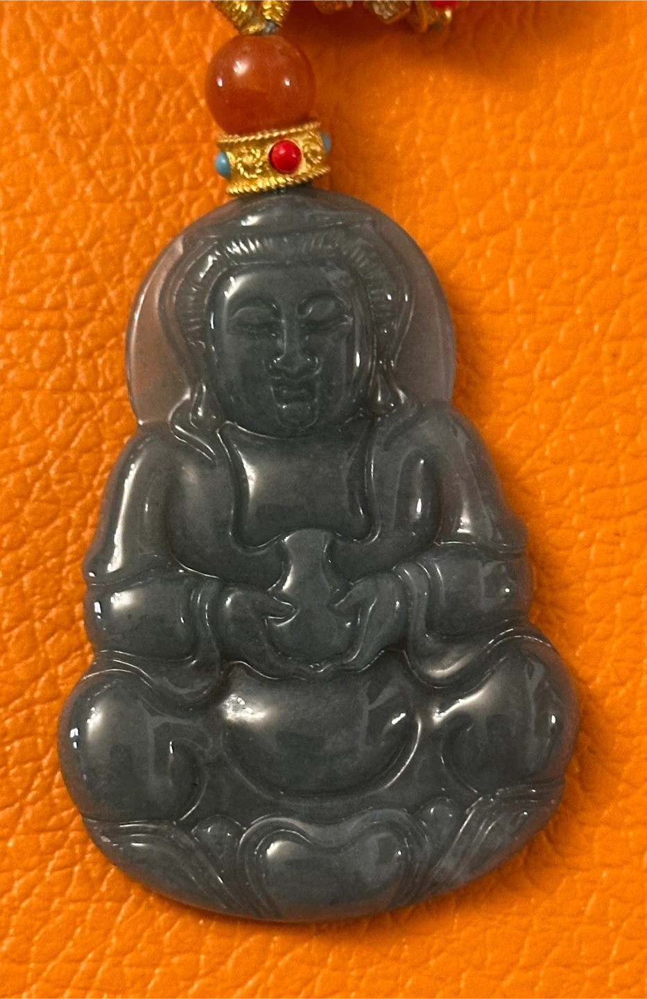 This pendant features a hand-carved figure of Guanyin, the Bodhisattva of Compassion, crafted from jade.