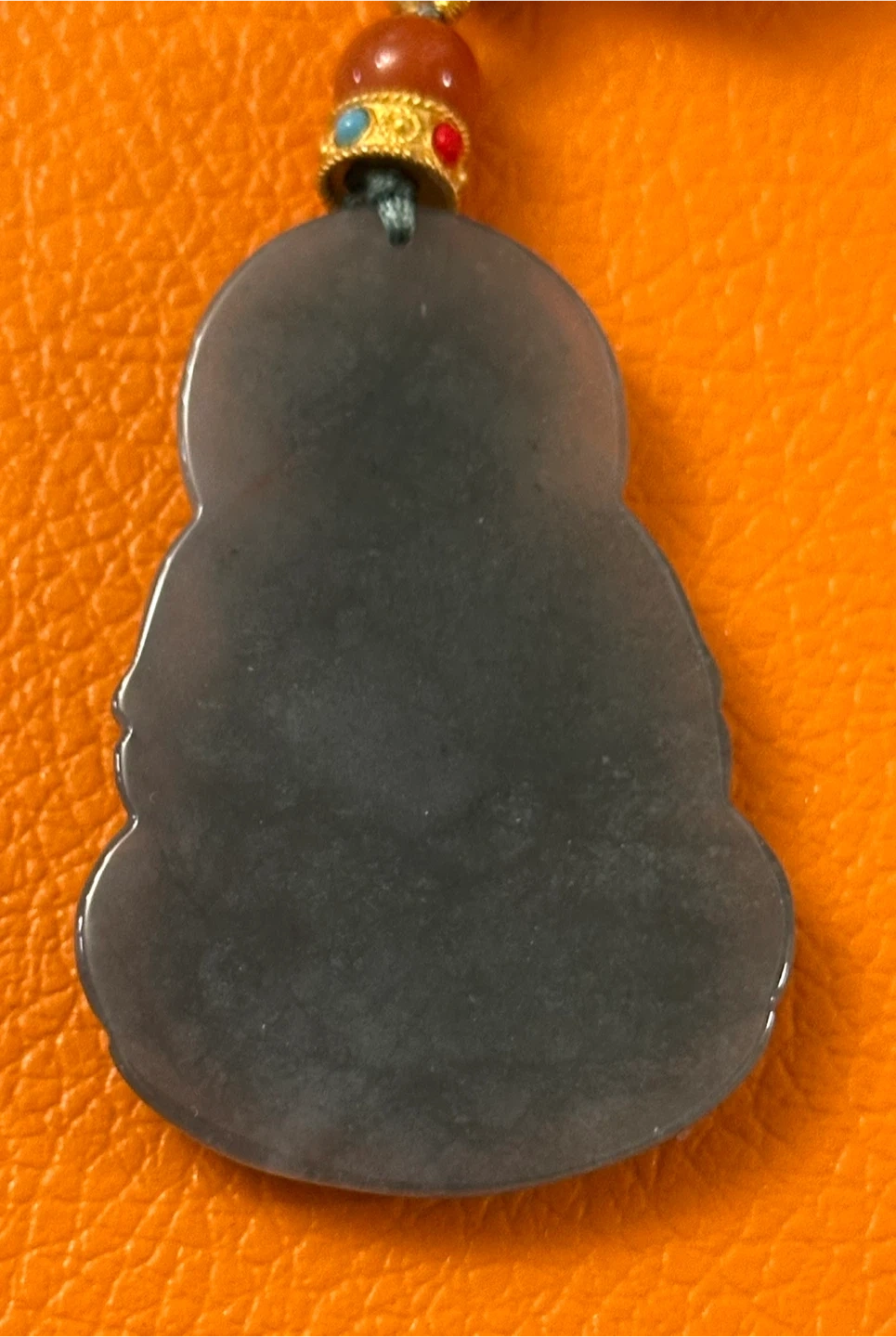 This is a carved high quality jade Guan Yin pendant with a blue hue. It measures 48.9mm x 35mm. The pendant hangs on a green cord with decorative beads.