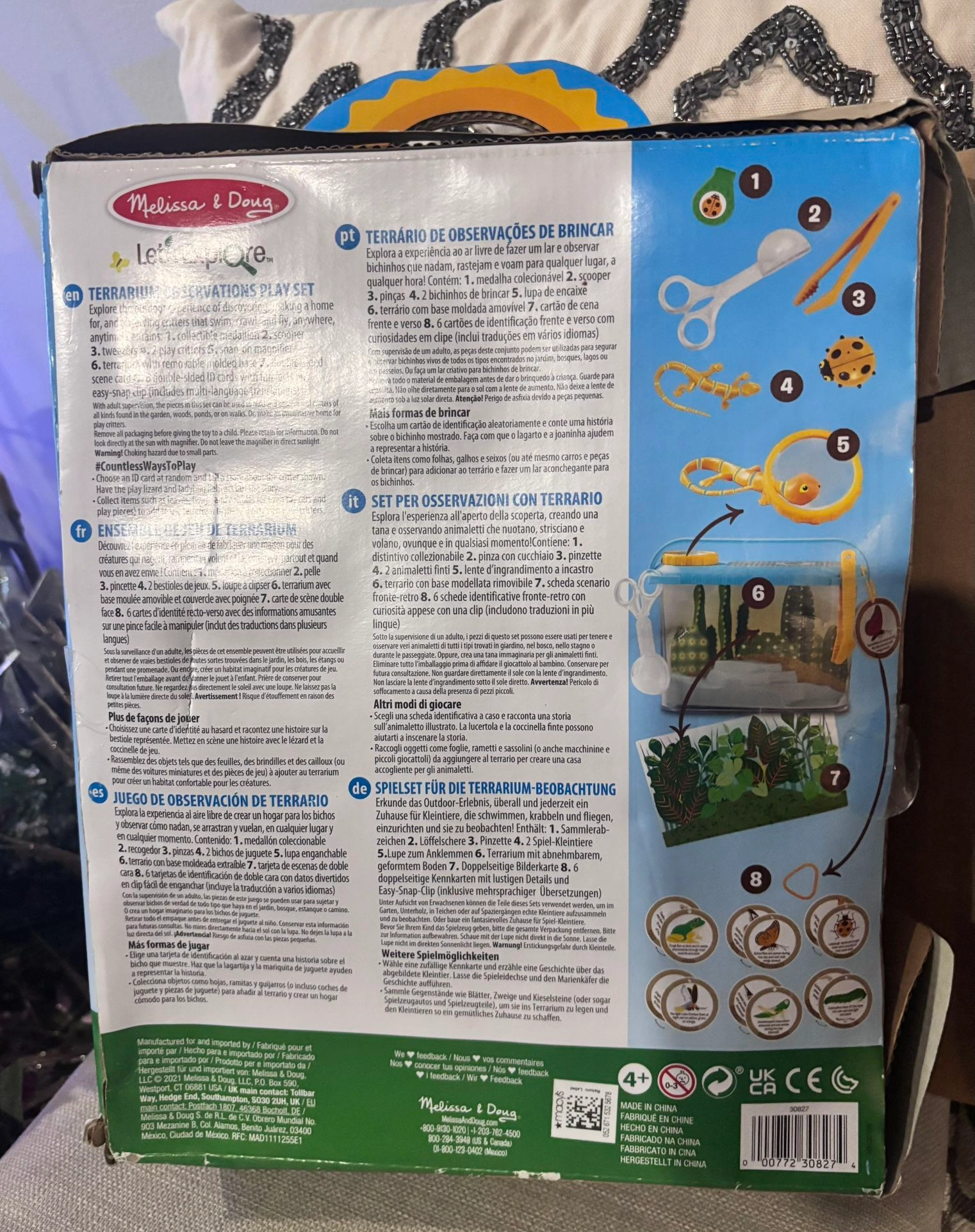 Everything is new, except the box. The box is damaged and frayed, but the contents inside are in their plastic and never used. Series: Let’s Explore. Age Range: 4+. Total Pieces: 16. Condition: New contents / Box shows wear. Explore the wonders of nature with this Melissa & Doug Let’s Explore Terrarium Observations Play Set. This engaging educational toy encourages hands-on discovery and imaginative play through insect and animal observation. All 16 original pieces are included and accounted for, verified against manufacturer contents. Outer box shows noticeable wear, including creases, edge damage, and crushing from storage. Please see photos. This item is not giftable due to box condition, but is perfect for play, homeschool use, or classroom learning. Included Pieces (Complete Set): Clear terrarium container with blue lid, Removable molded base platform, Clear plastic. Brand: Melissa & Doug.