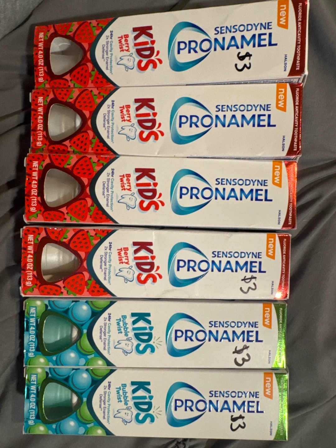 I have new Sensodyne ProNamel Kids toothpaste for sale! Each tube is 4.0 oz (113 g). Available in Berry Twist and Bubble Twist flavors. They provide 24-hour cavity protection and 2x stronger enamel defense