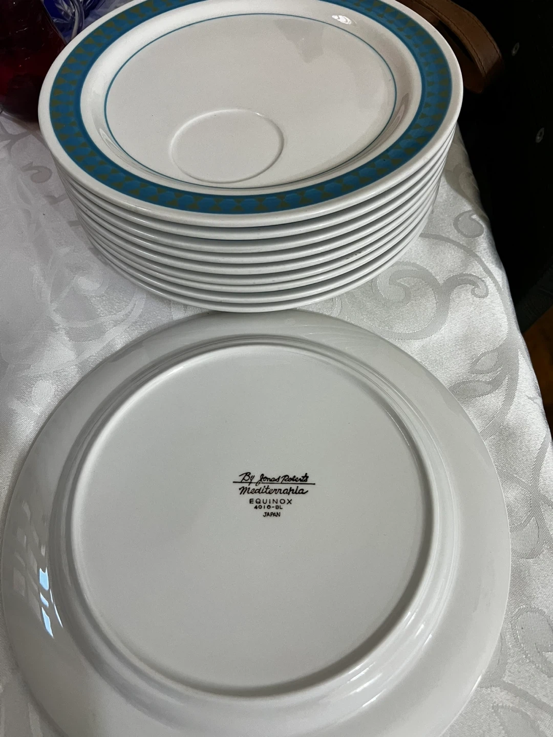 This is a set of 10 salad plates by Jonas Roberts, from the Mediterrania collection. They feature a white base with a blue and green geometric band. Plates are made in Japan.