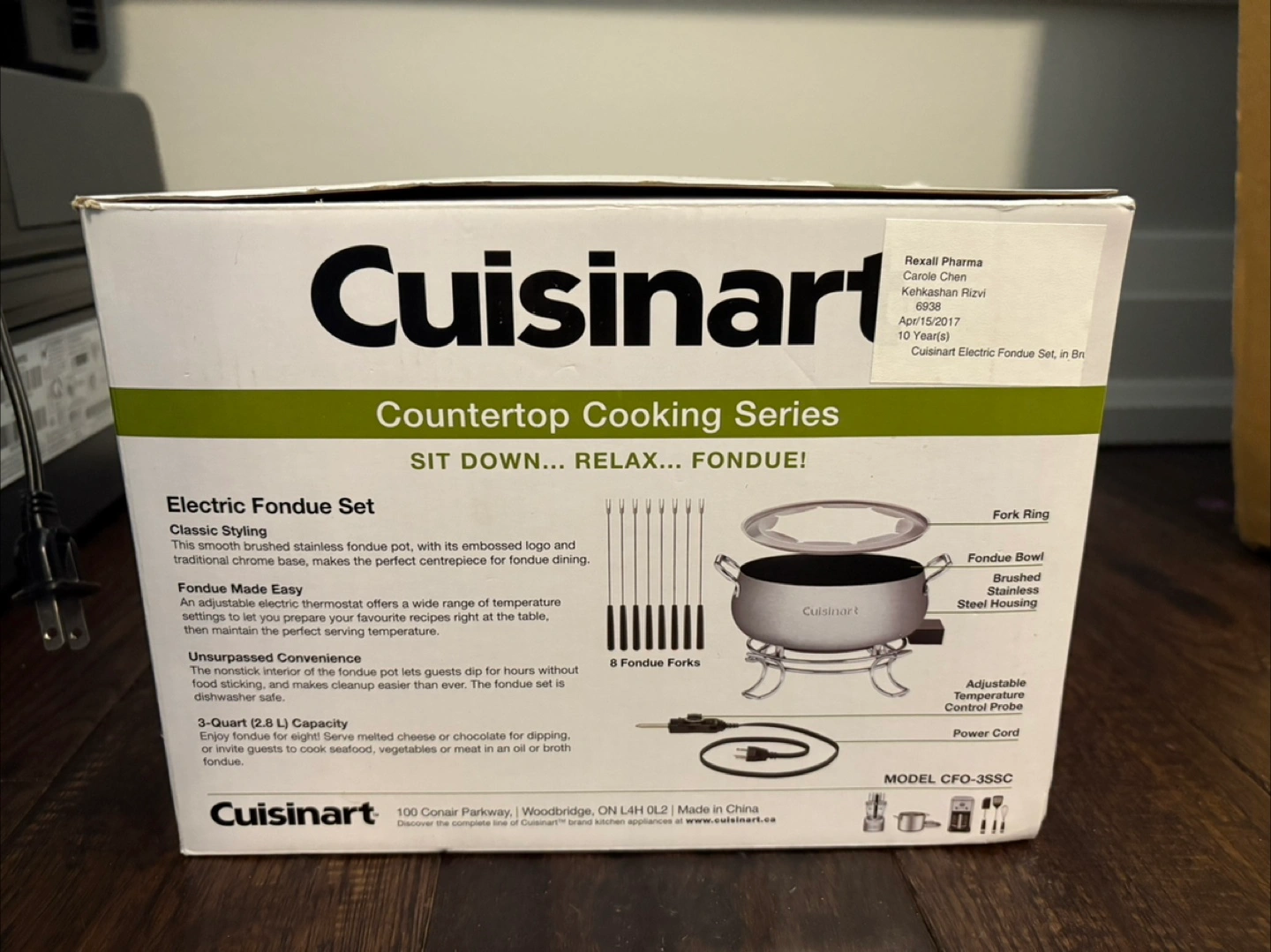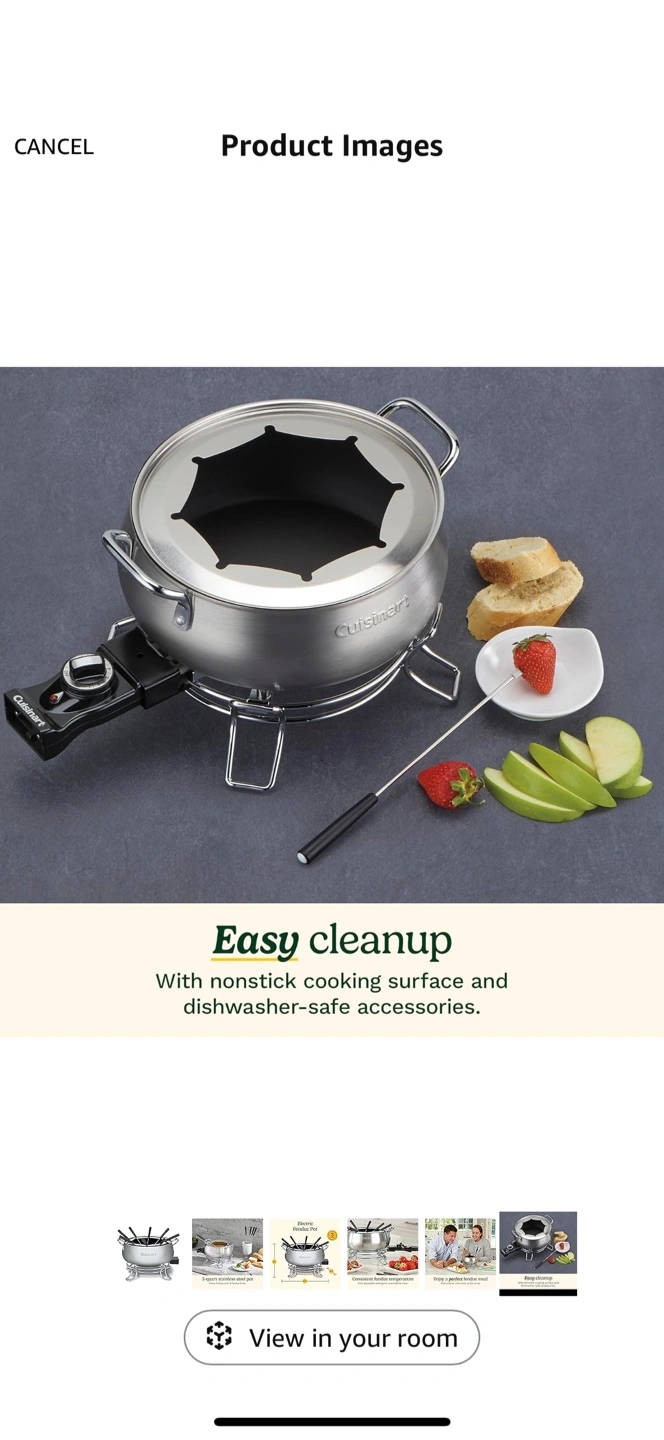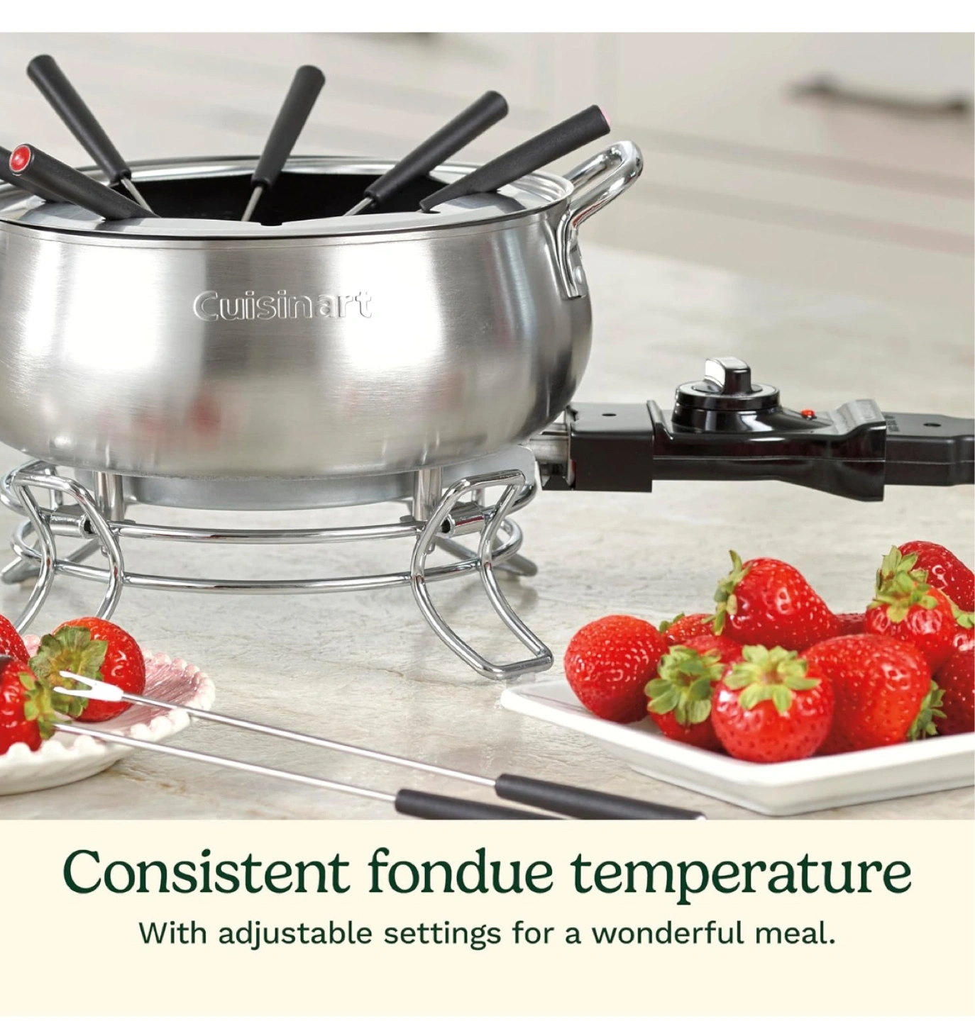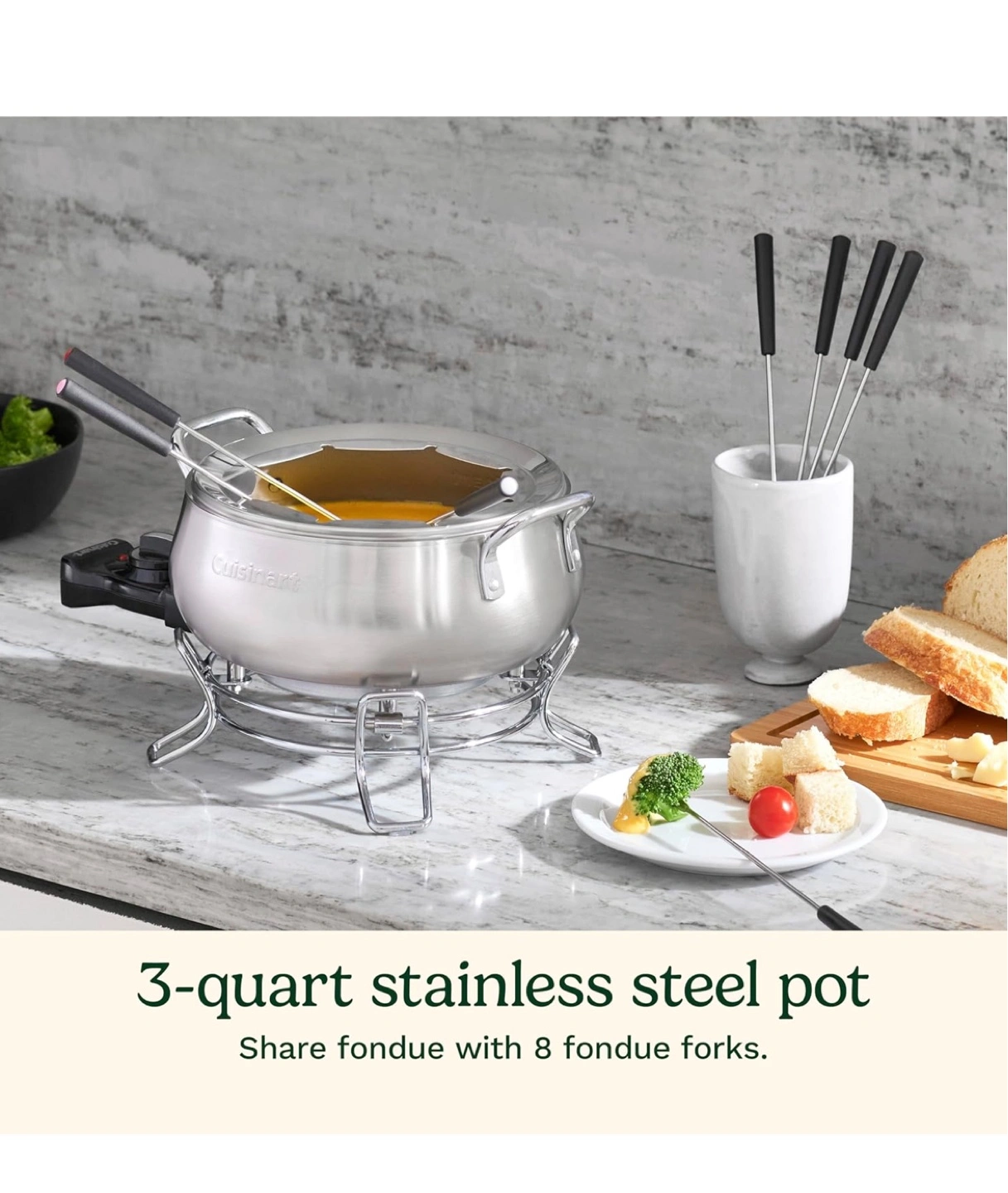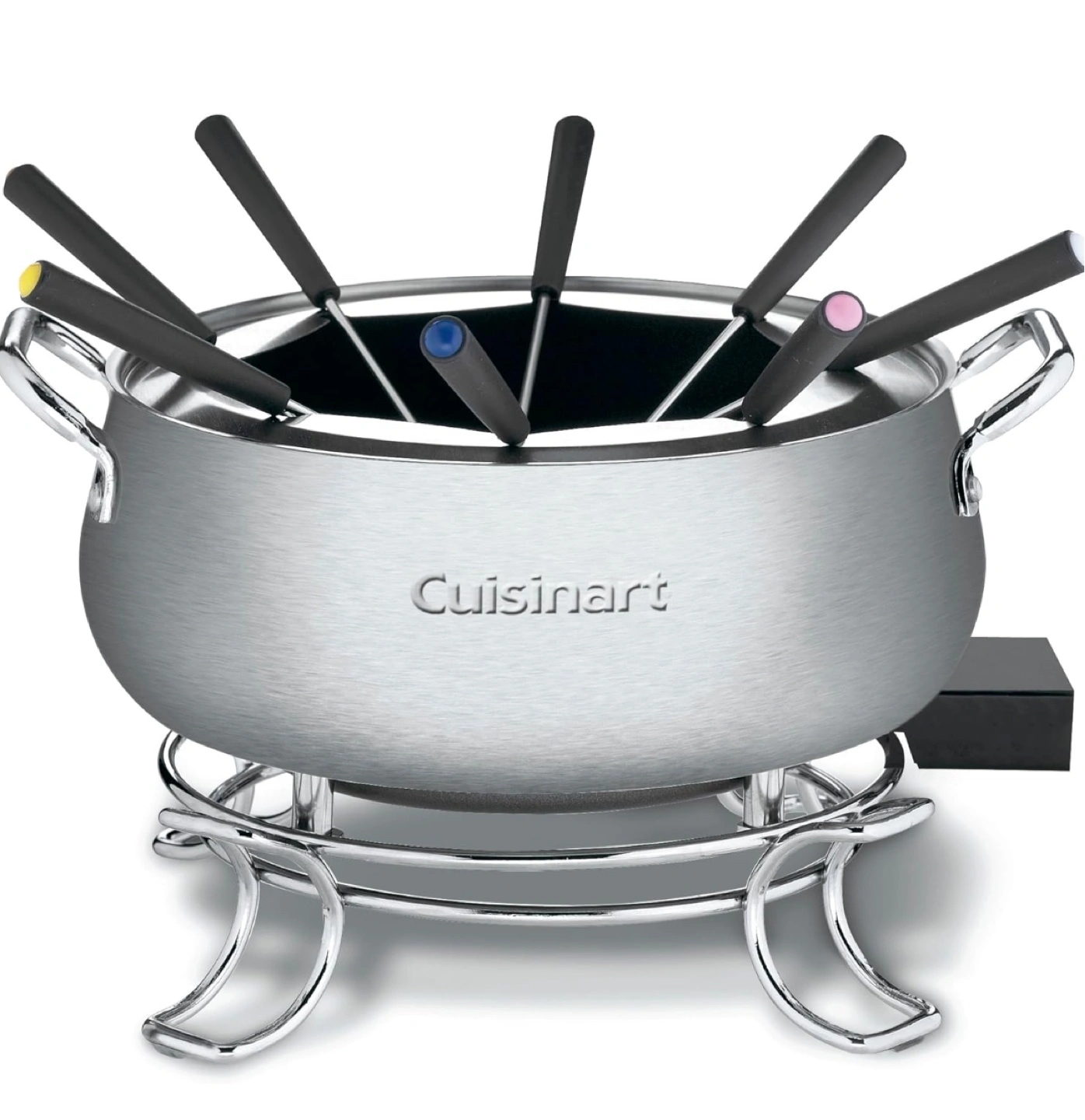Cuisinart countertop electric fondue set. Features a 3-quart stainless steel pot, eight fondue forks, and adjustable temperature control. Non-stick interior. Dishwasher safe. Model CFO-3SSSC.
