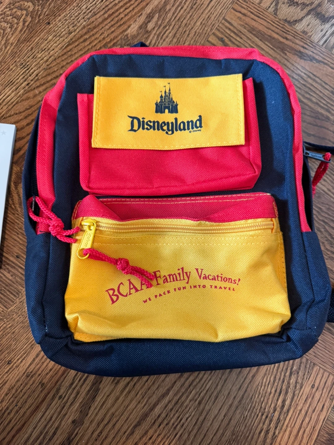 This is a Disneyland California backpack featuring multiple compartments. It includes two Mickey Mouse themed pens and a Goofy's Holiday Feast 2000 pin. Perfect for carrying essentials on a trip!