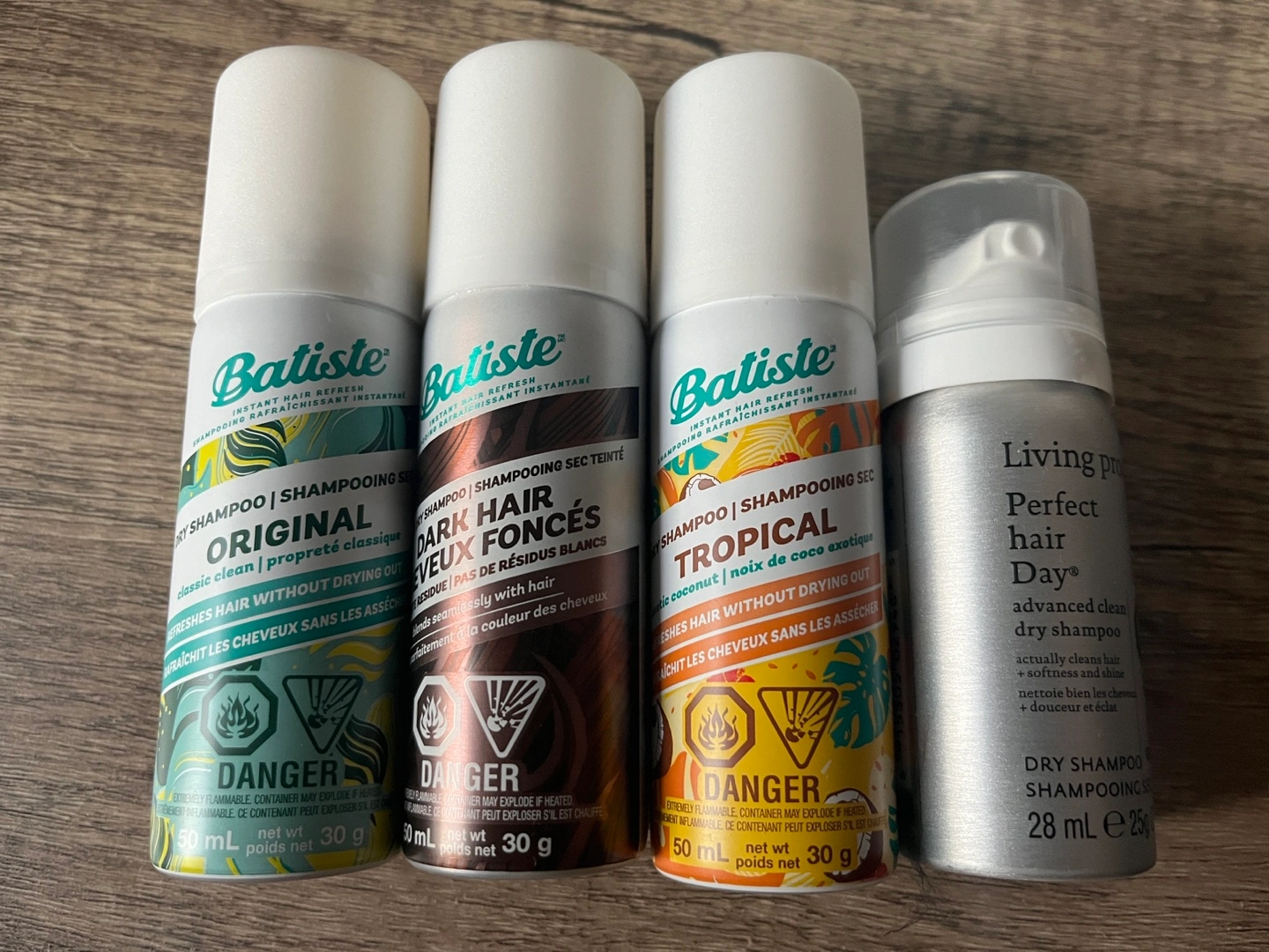 - Batiste Dry Shampoo (Original, Dark Hair, Tropical), 50mL: $5 each