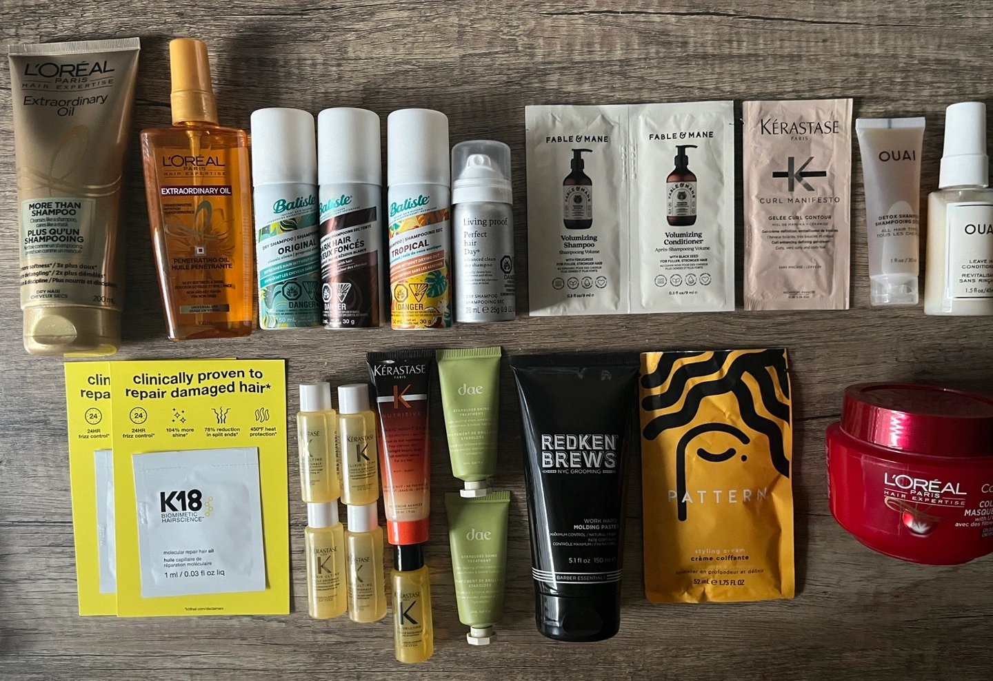 A variety of new and never used, travel-sized hair care products, including oils, shampoos and conditioners.