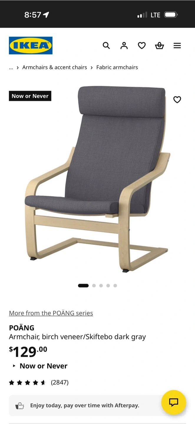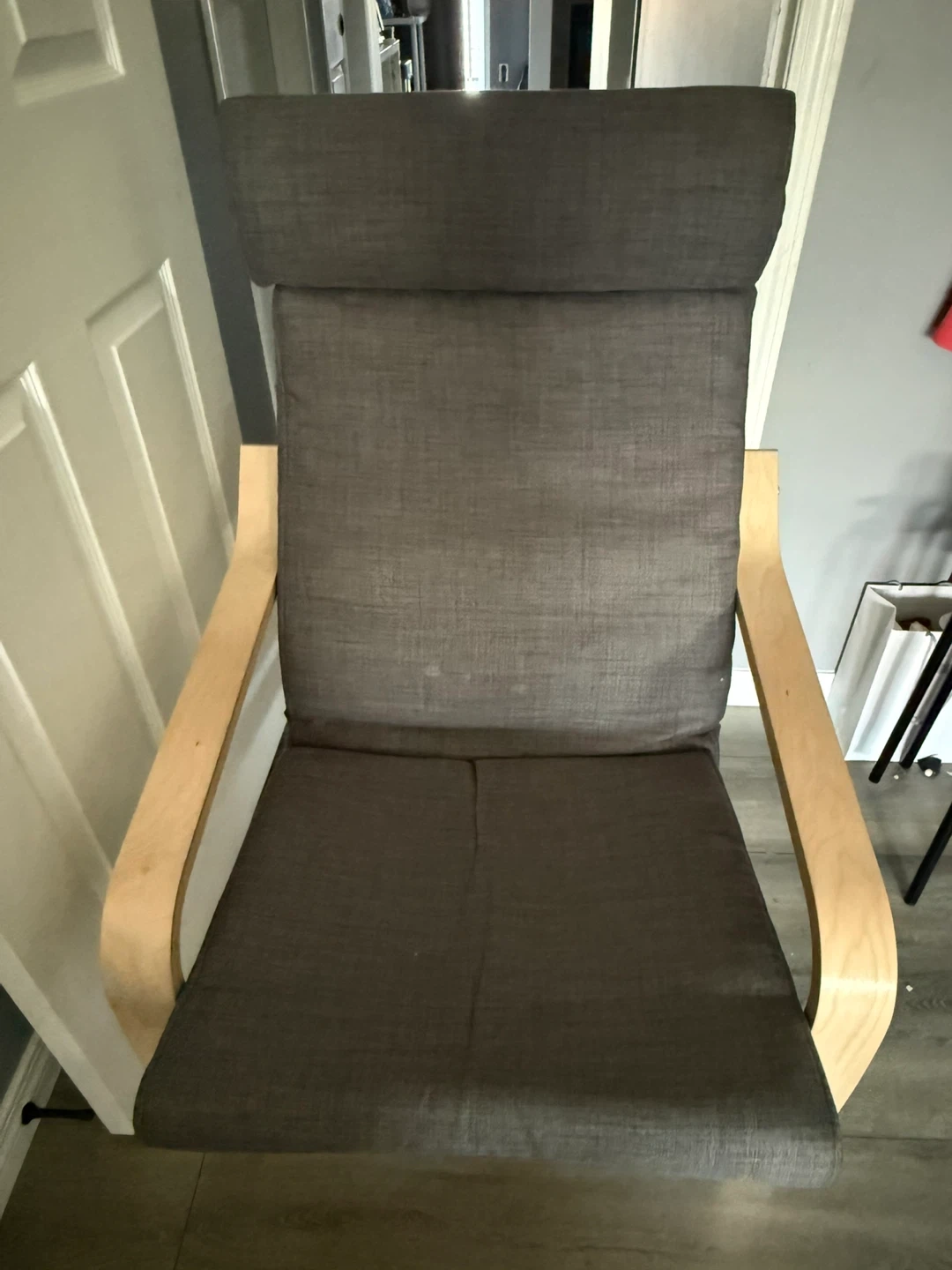 This IKEA POÄNG armchair features a birch veneer frame and Skiftebo dark gray upholstery. It's a comfortable addition to any living space. Great for reading or relaxing!