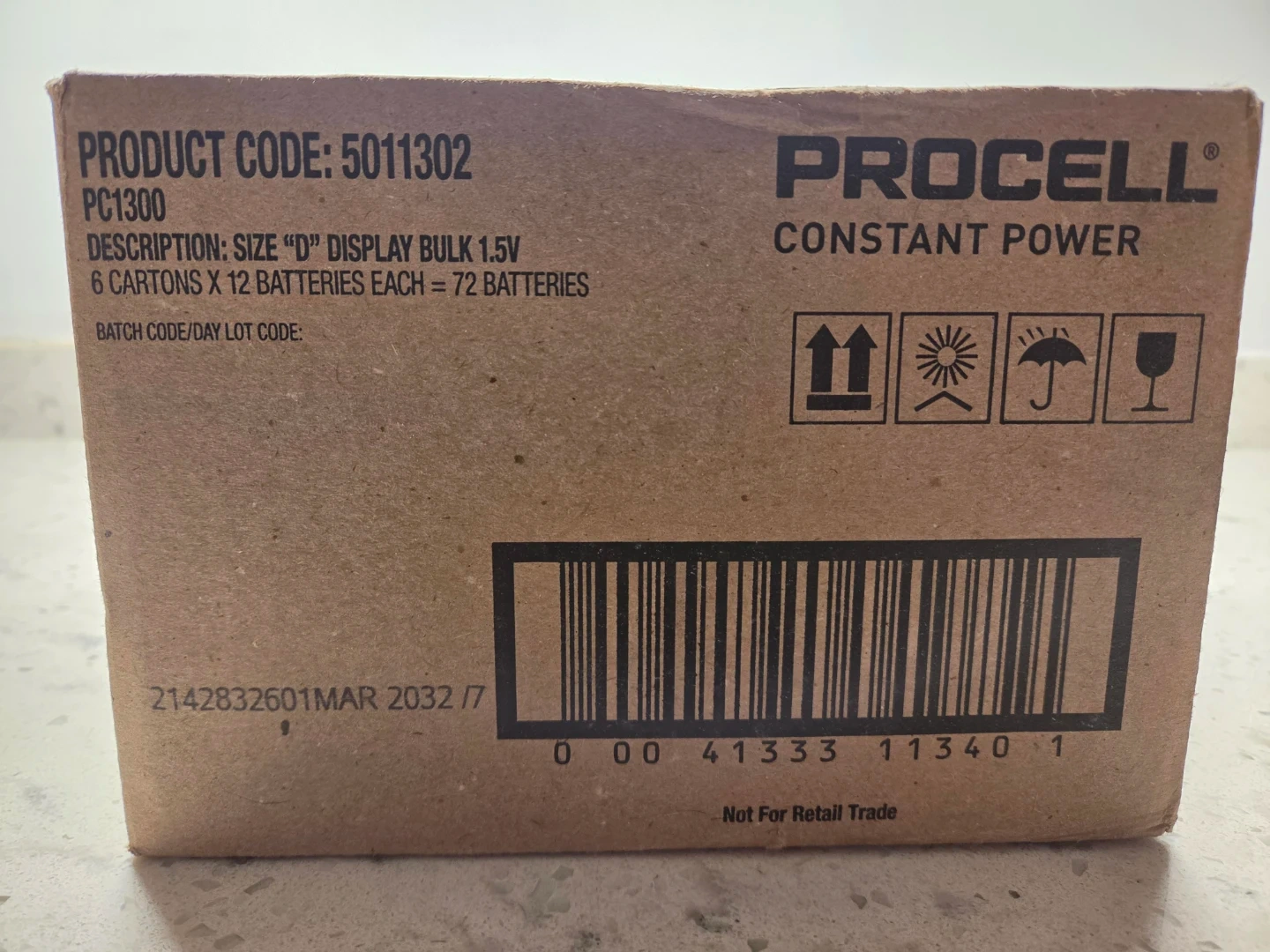 PROCELL Constant Power D batteries. This bulk display contains 6 cartons, with 12 batteries each, for a total of 72 batteries. March 2032 date. These are 1.5V batteries.