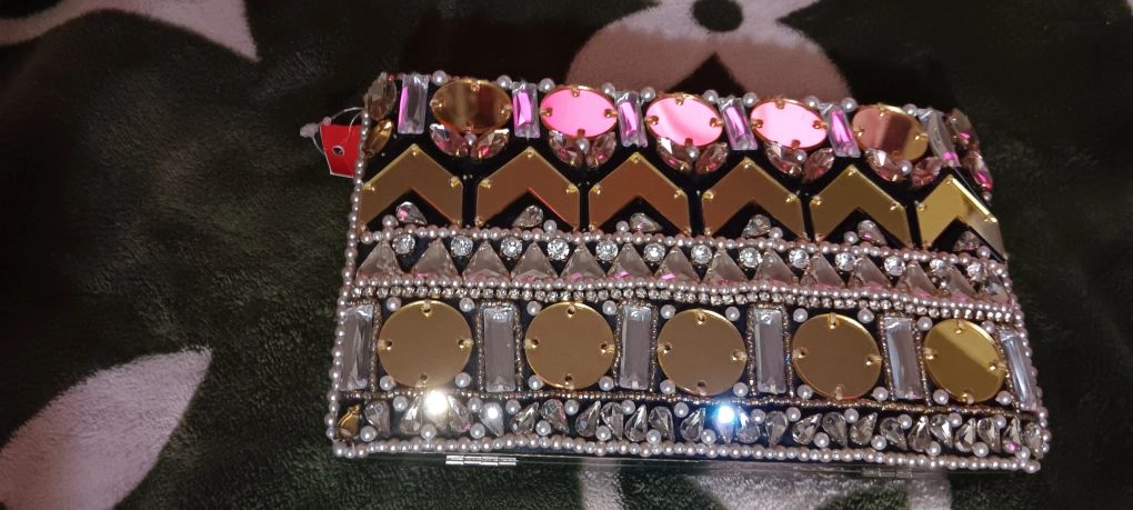 Stunning jeweled clutch. Features gold and pink mirror accents. Black fabric base. Pearls and rhinestones throughout. Perfect for a special occasion.