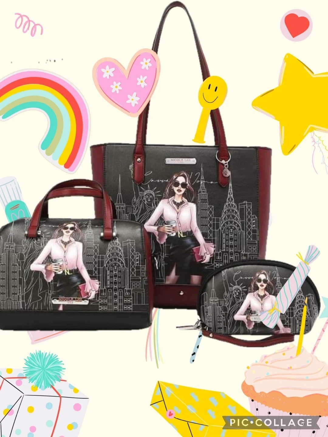 Selling a Nicole Lee handbag set! This set includes a tote bag, a smaller satchel, and a wristlet. All feature a unique New York City themed design with a stylish woman illustration. Perfect for adding a touch of city chic to your wardrobe!