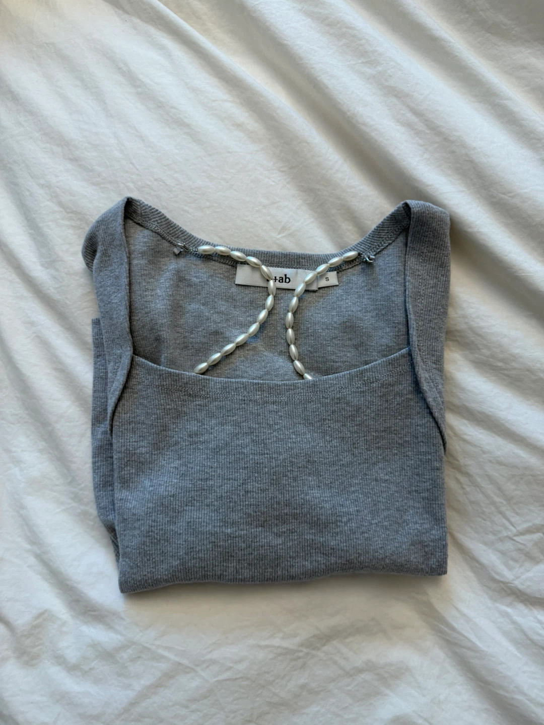 Grey ribbed square neck crop top from biab. Features a short sleeve design with a unique pearl beaded detail across the neckline. Size is S. Made of a stretchy knit material for a comfortable fit.