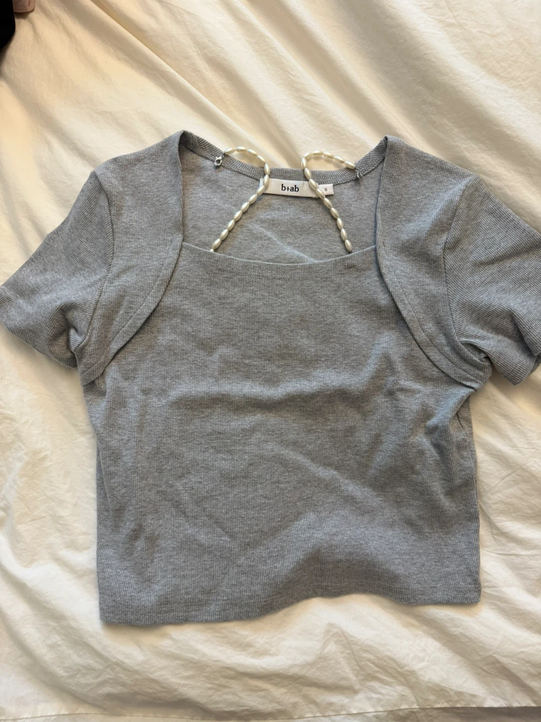 Grey ribbed square neck crop top from biab. Features a short sleeve design with a unique pearl beaded detail across the neckline. Size is S. Made of a stretchy knit material for a comfortable fit.