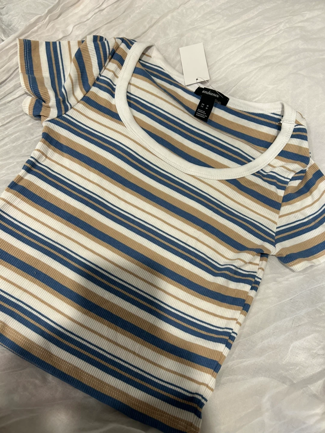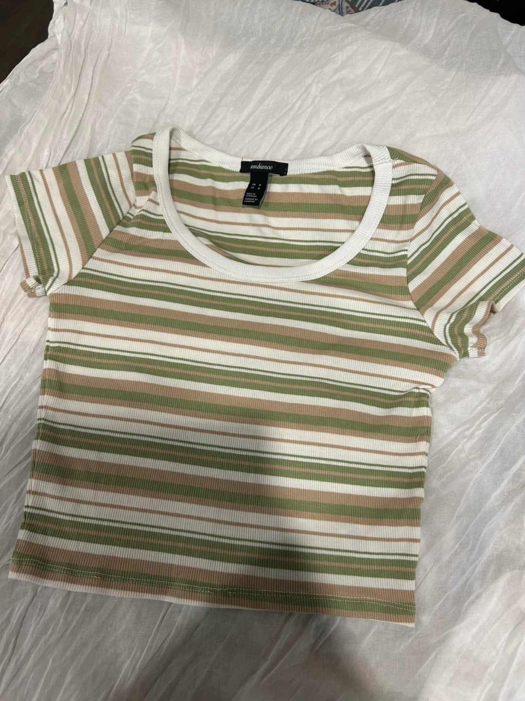 I'm selling these cute Embrace ribbed crop tops! They're perfect for a casual day out or layering. One is in a lovely green, white, and tan stripe, and the other is in a stylish blue, white, and tan stripe. Both are in great condition and ready for a new home