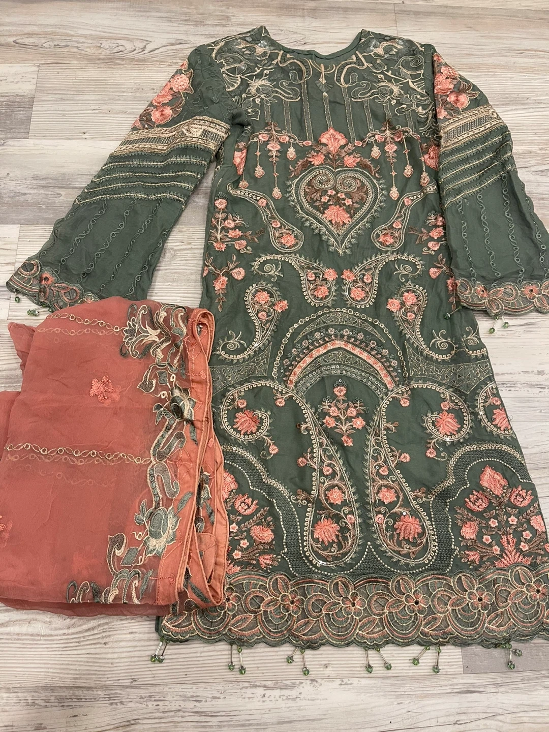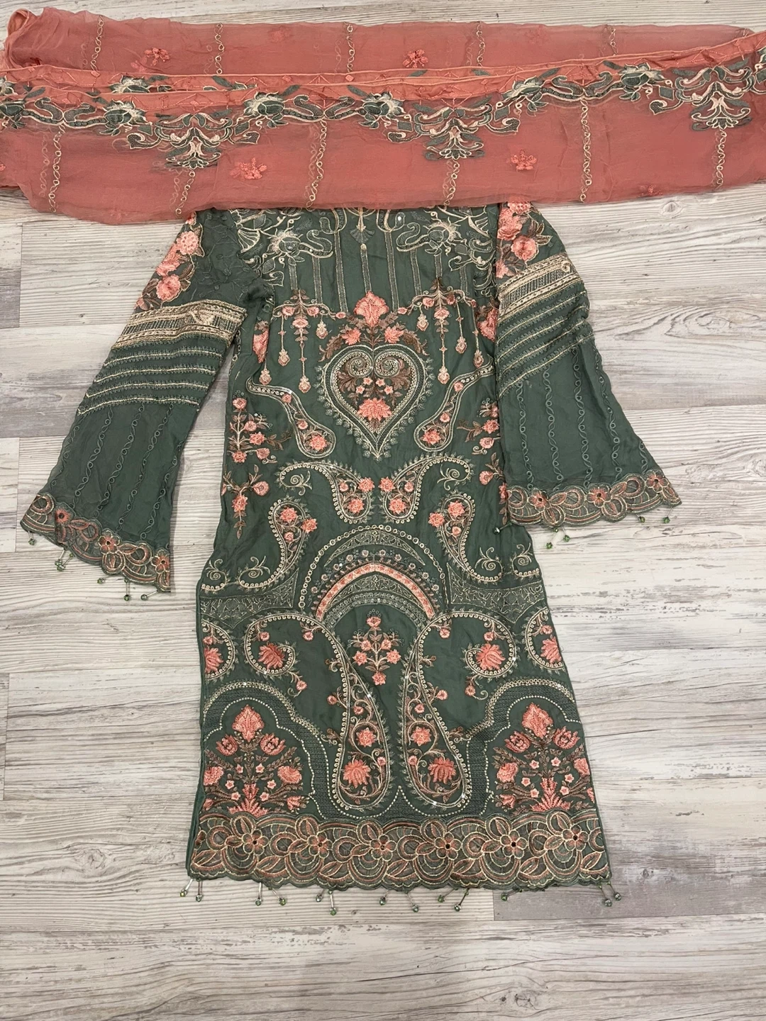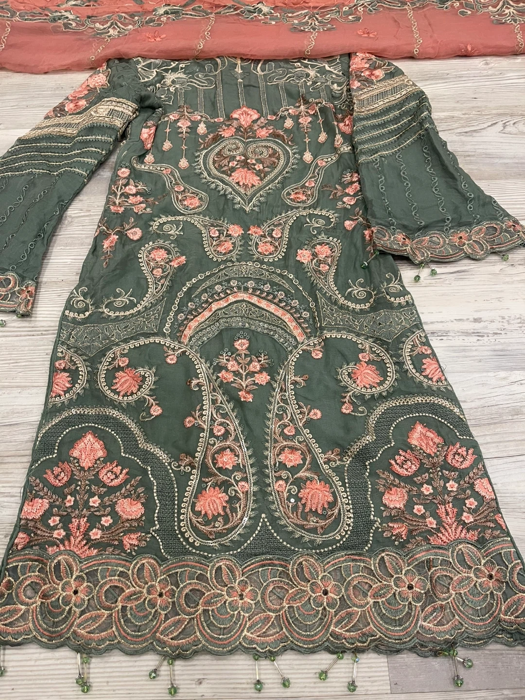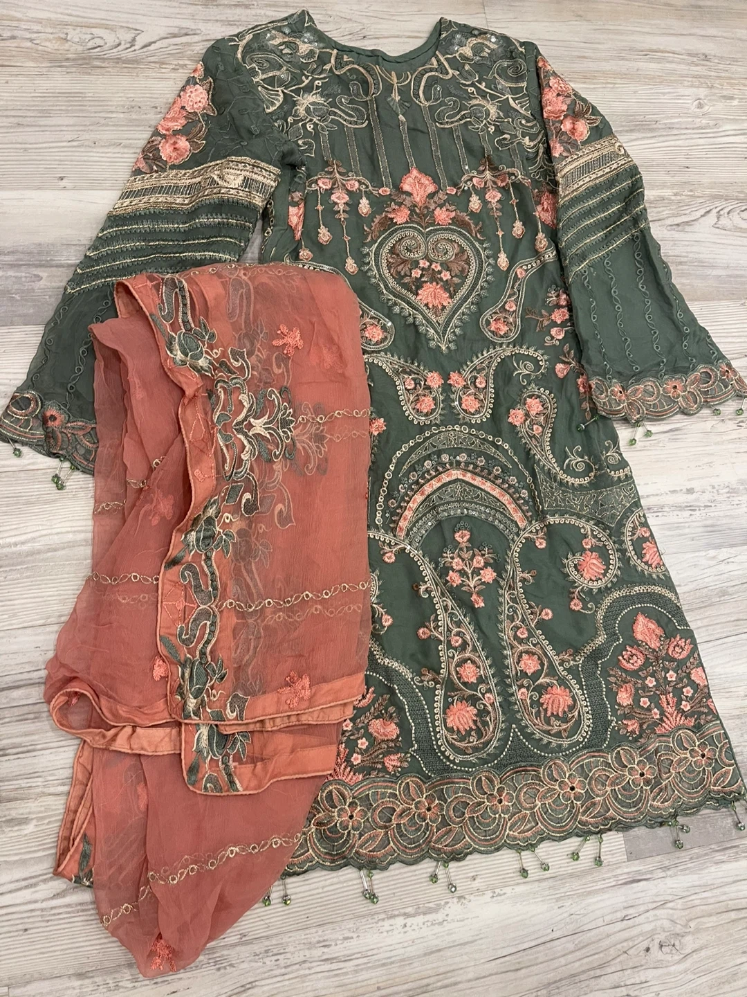 102 PC Beautifully embroidered sequence kameez suit with intricate detailing. The set includes the kameez (tunic),and dupatta (scarf). Perfect for special occasions or cultural events! The colour is a unique blend of green and peach coral, and beige n gold mix making it stand out.Beaded tassel hanging. A detail peace of artwork. Chest 18-19.5 inside alterations can be made. Set price cash payment only.