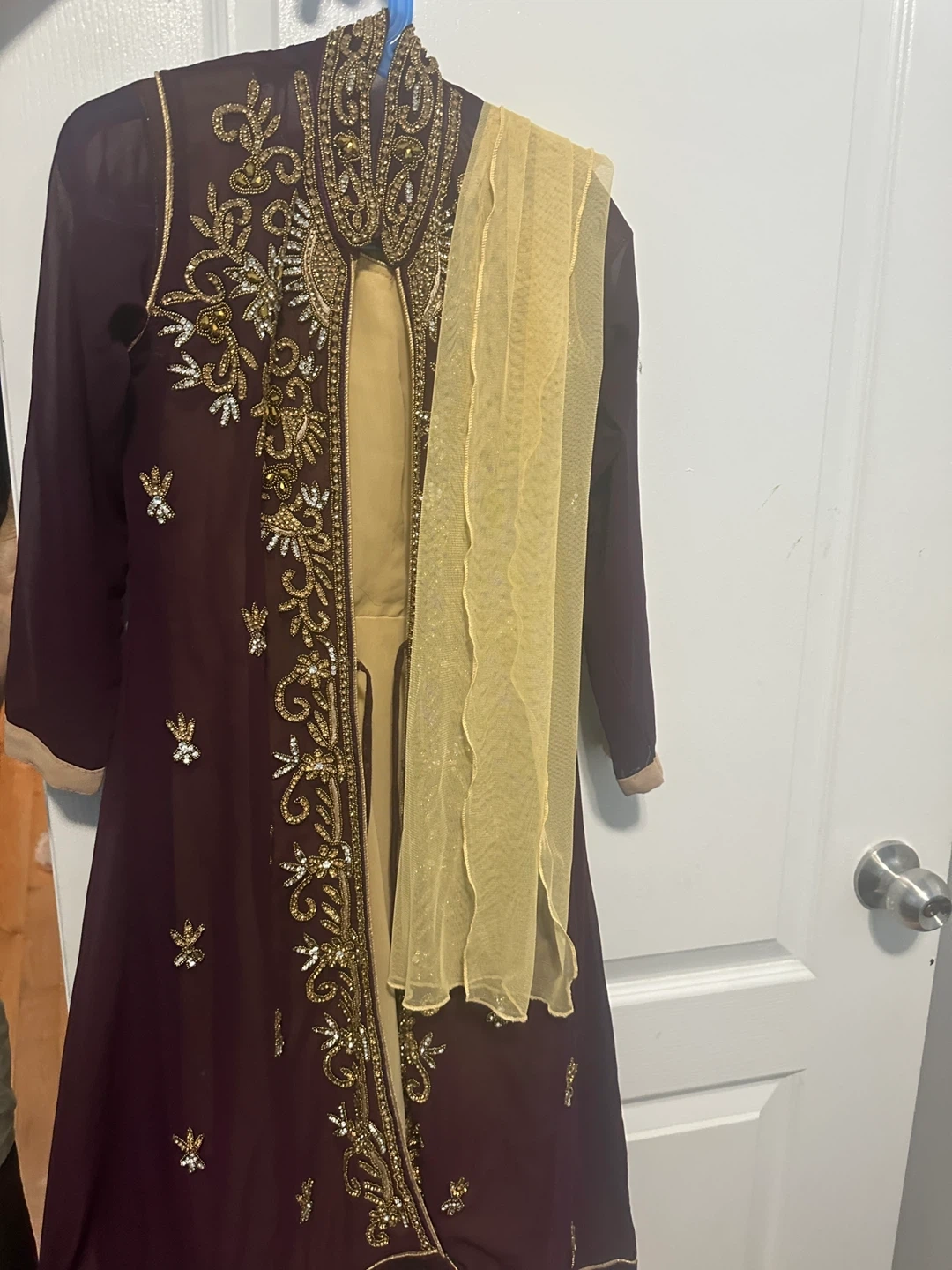 83Selling a beautiful embroidered dress with a matching scarf. The dress features intricate gold detailing on a rich burgundy fabric. It's in great condition and ready for a new home!