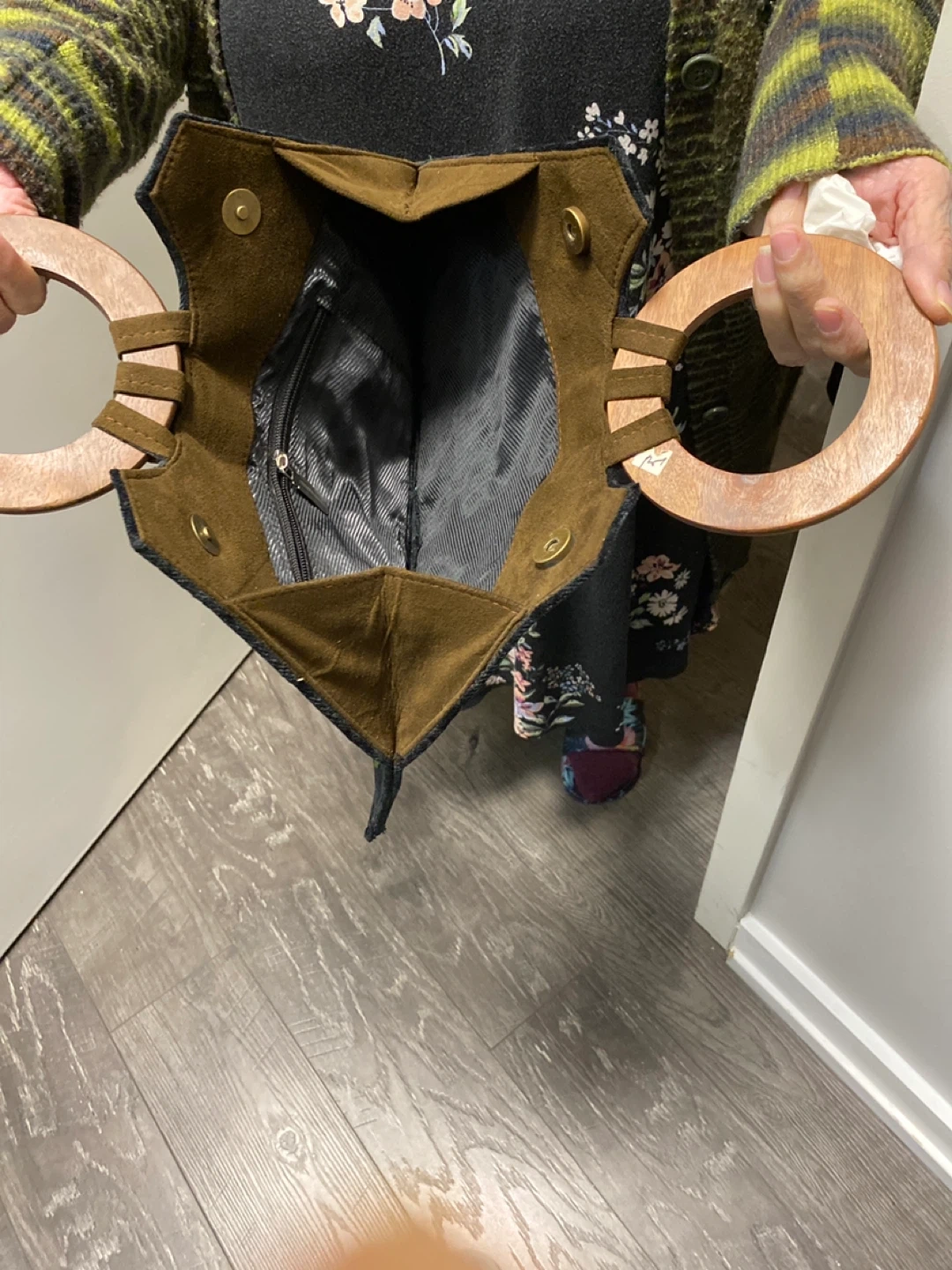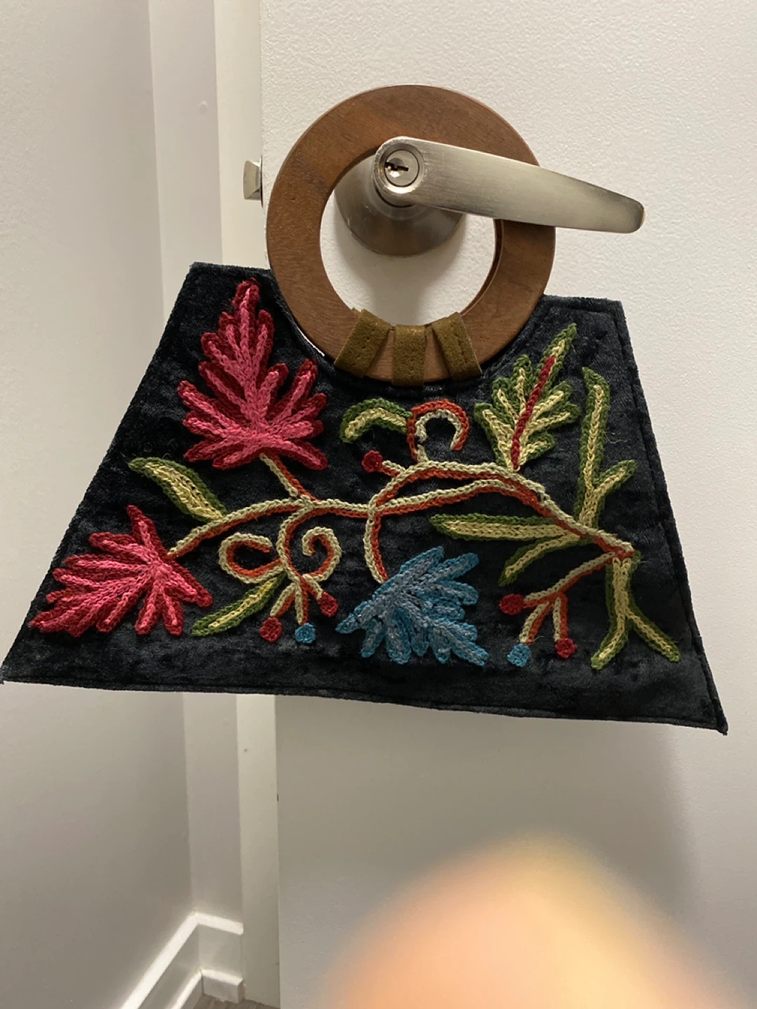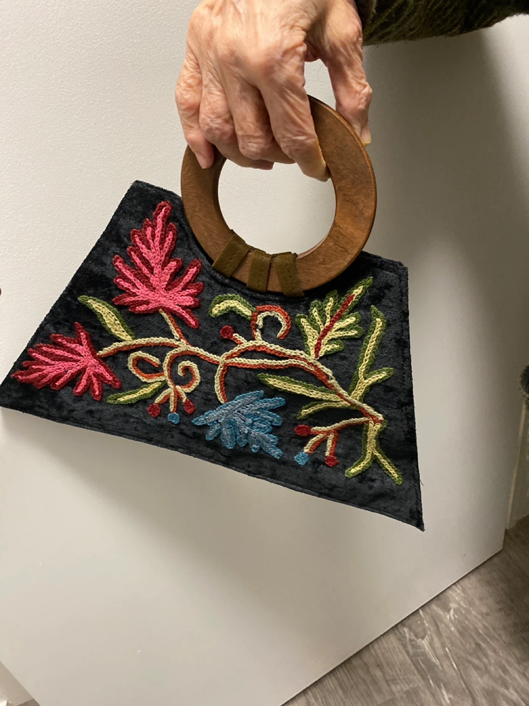 87Unique handbag featuring beautiful embroidery and stylish wooden handles! It's a real statement piece that's sure to turn heads
