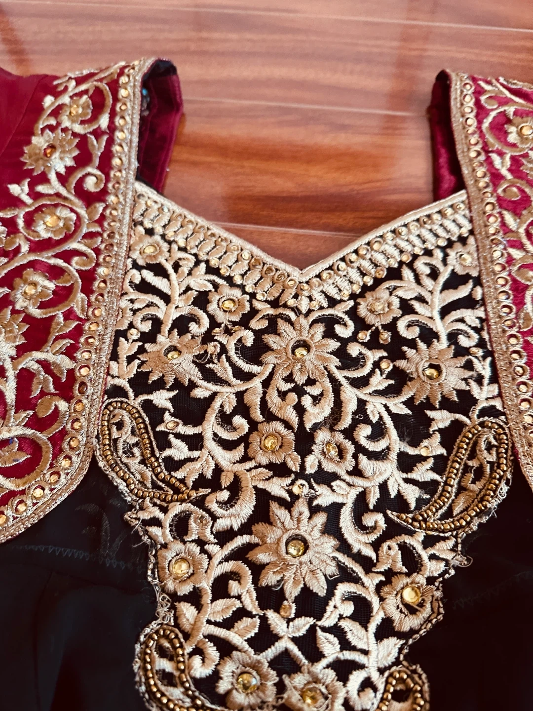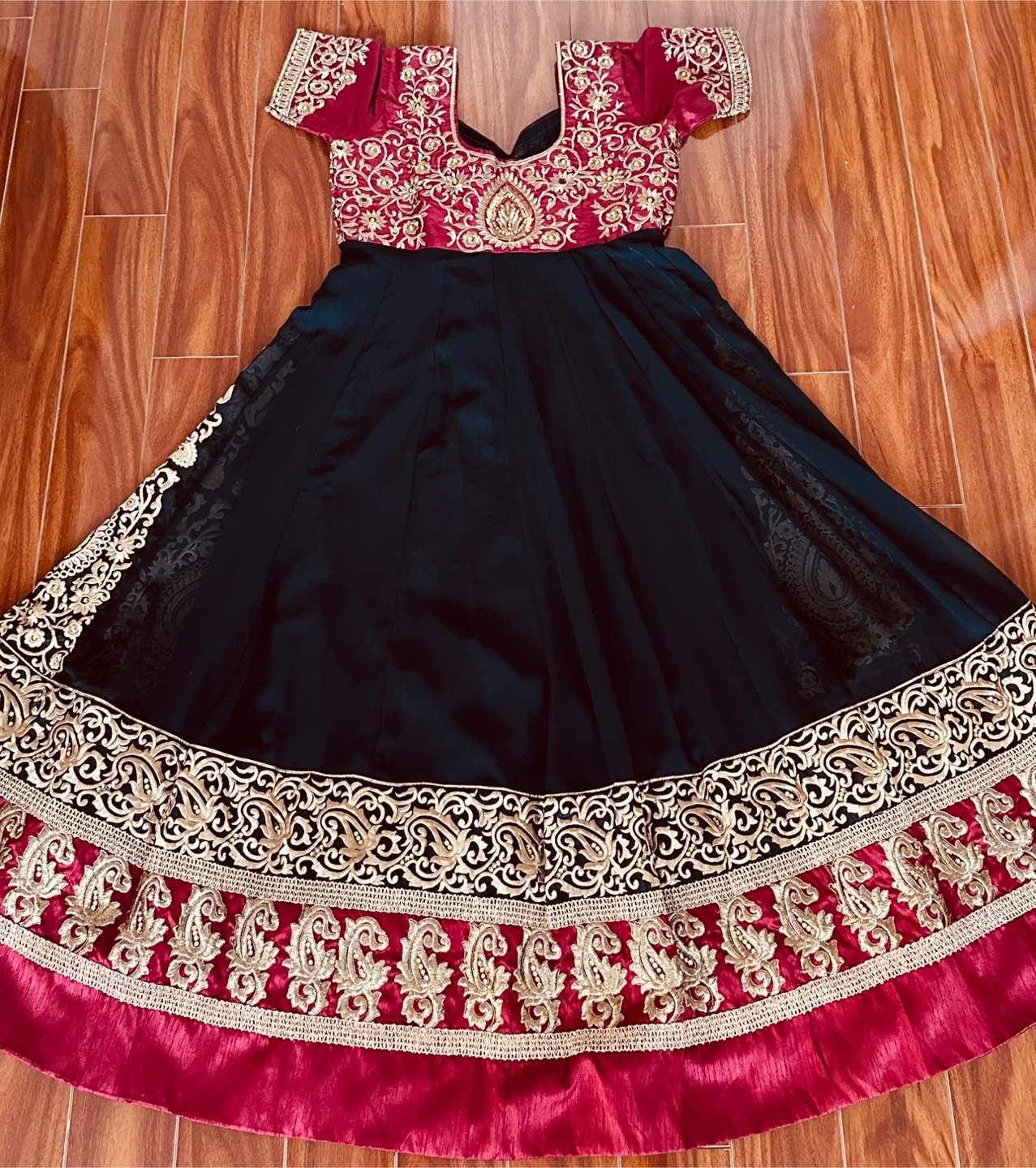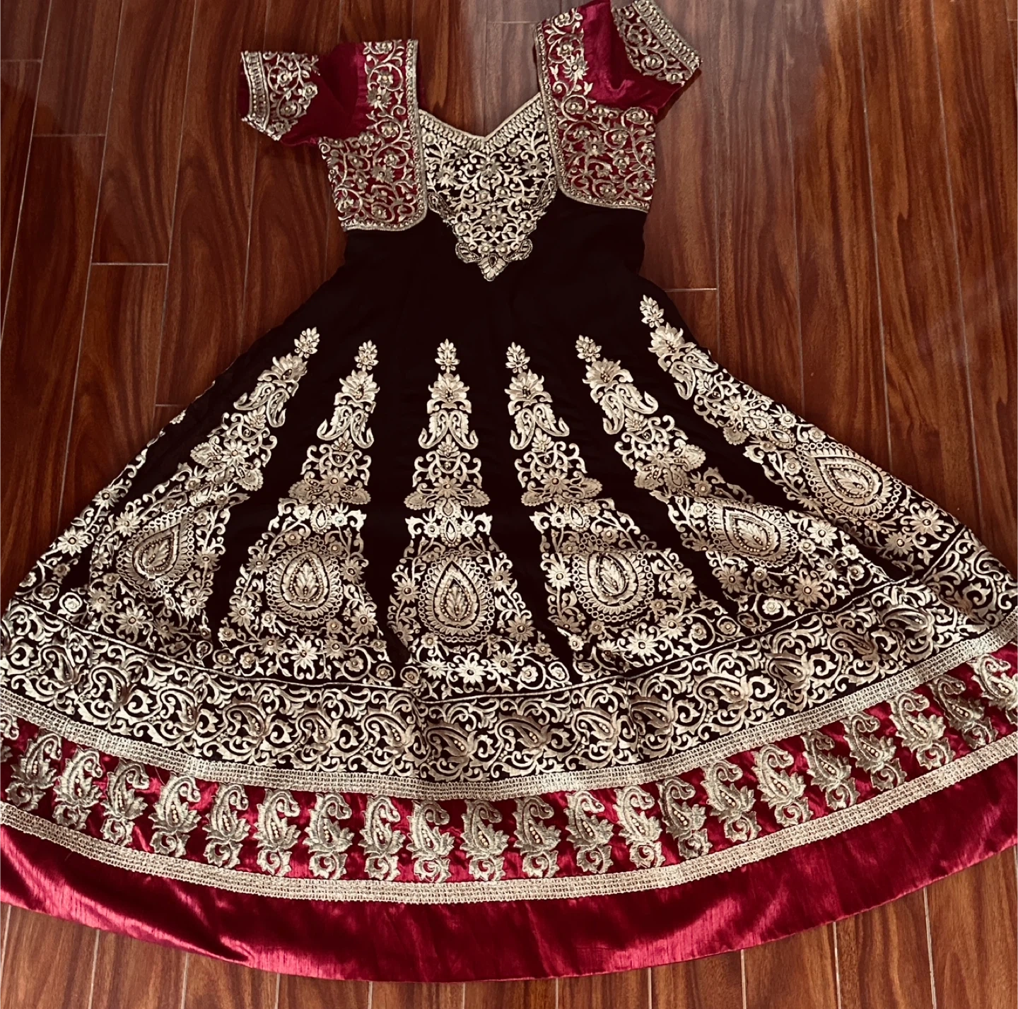 30Beautiful Indian dress with intricate embroidery in red, black, and gold. The dress features a detailed bodice and flowing skirt, perfect for special occasions! The material feels luxurious and the craftsmanship is stunning