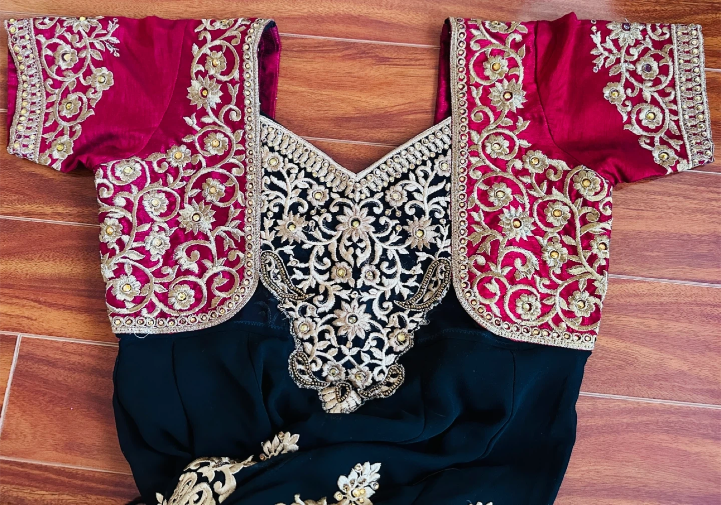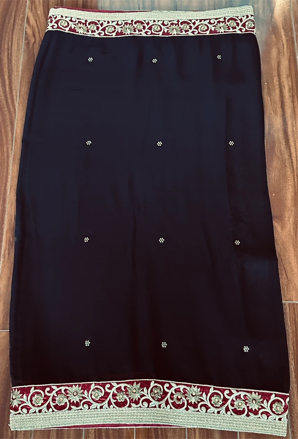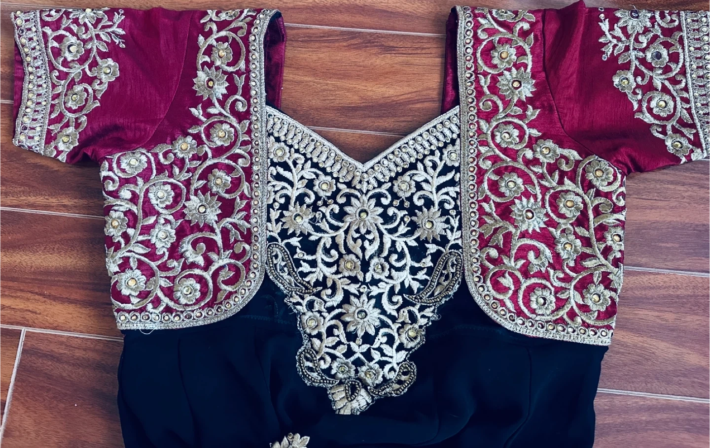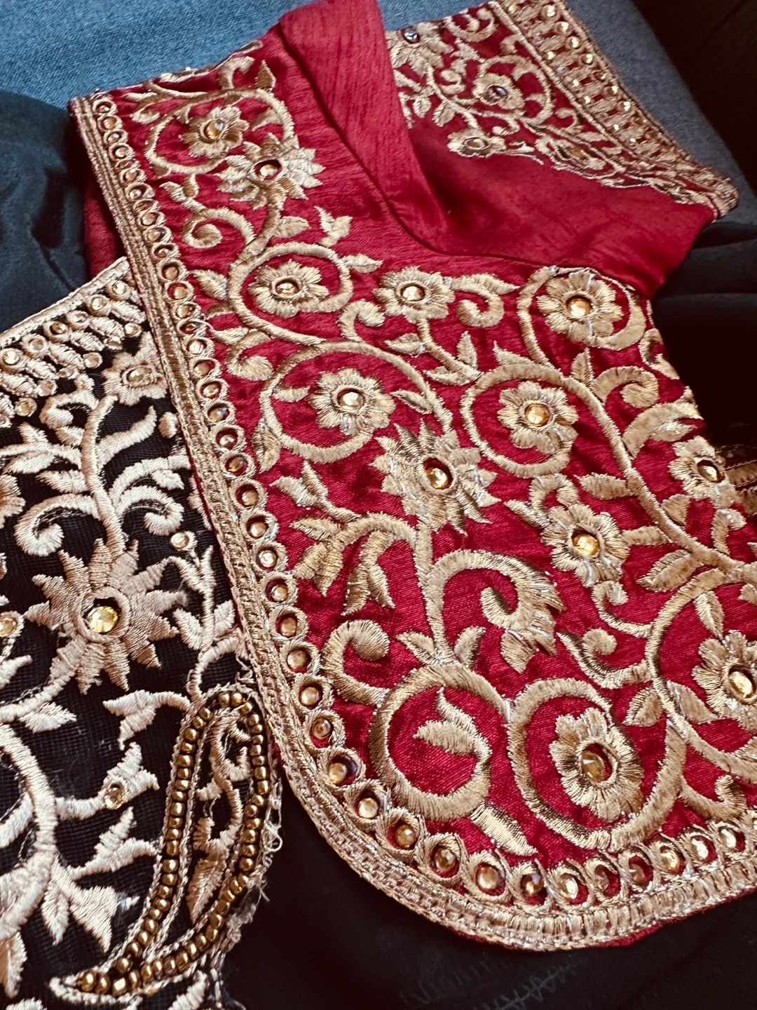 30Beautiful Indian dress with intricate embroidery in red, black, and gold. The dress features a detailed bodice and flowing skirt, perfect for special occasions! The material feels luxurious and the craftsmanship is stunning