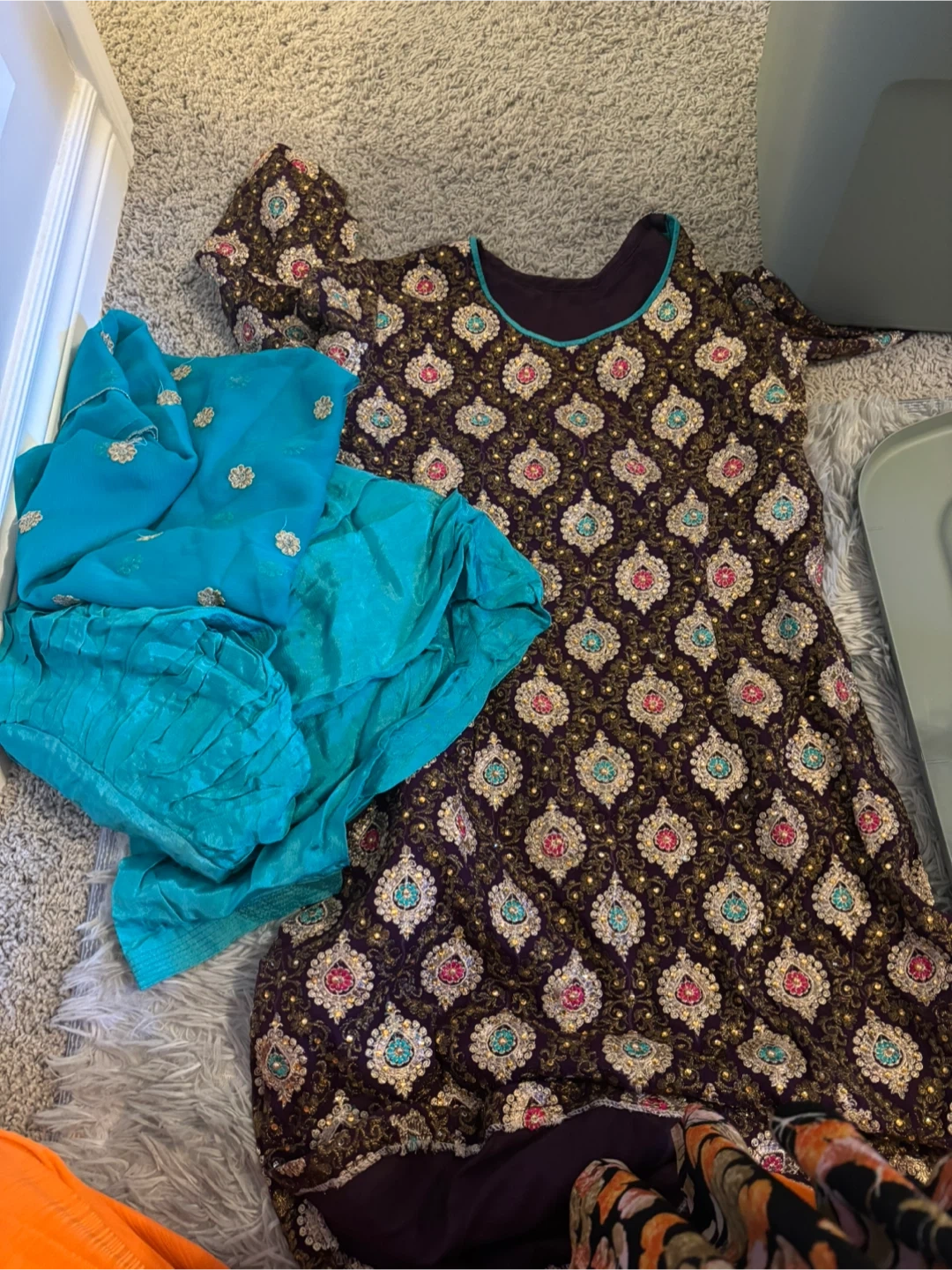 0Beautiful salwar kameez suit with intricate embroidery. Includes the kurta, salwar (pants), and dupatta (scarf). Perfect for special occasions or cultural events!
