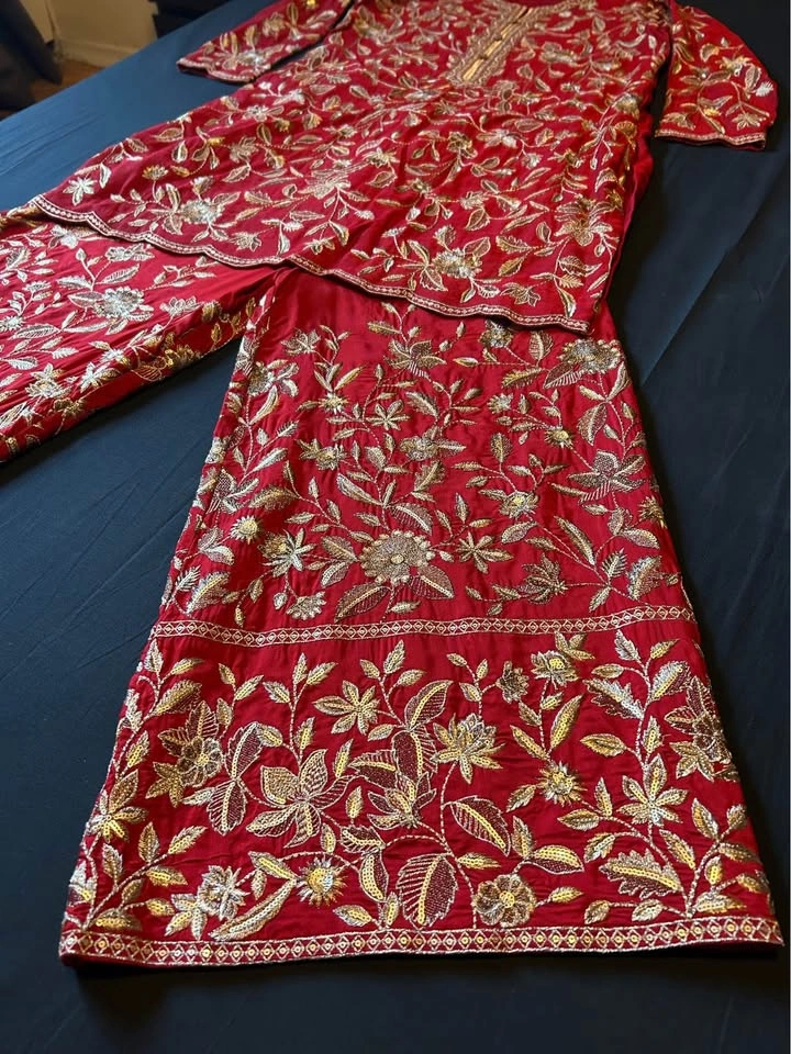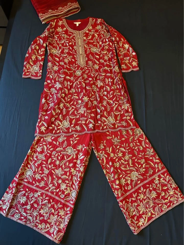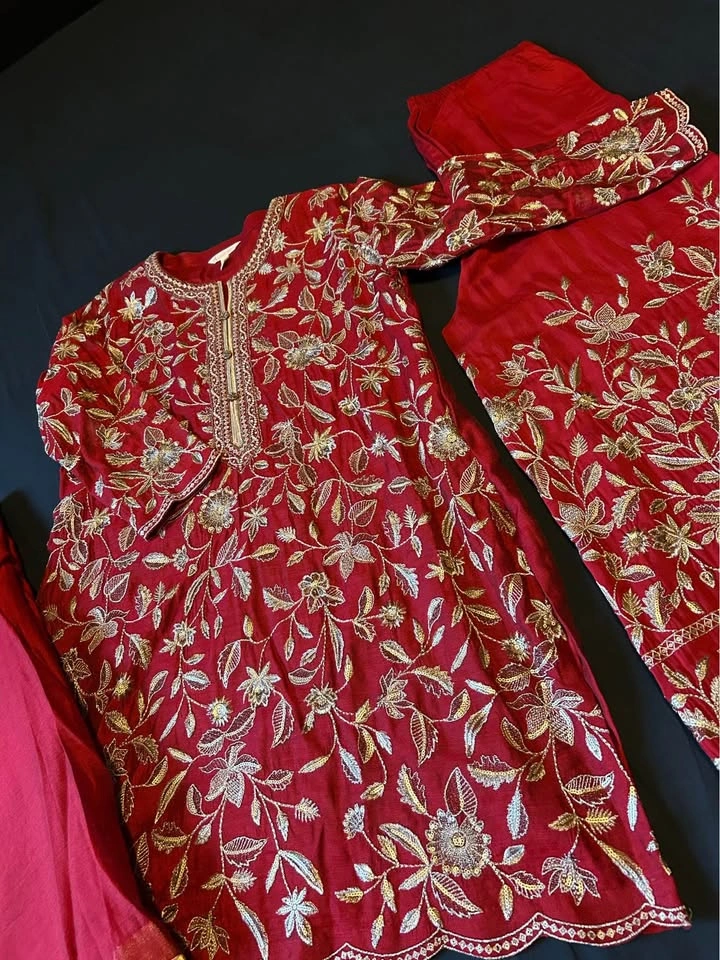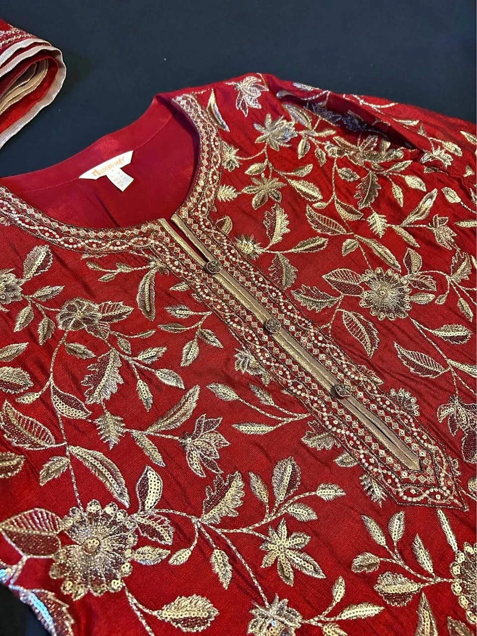 15Nishat Linen Luxury Pret Women Dress 3 Pieces: Shirt, Plazzo Trouser and Dupatta Shirt front, sleeves, trouser and Duppatta Borders embroidered with tilla work Measurements: Shirt: Length: 35.5 in Sleeves: 19 in Chest: 21 in Shoulder:15 in Plazzo Length: 37.5 in