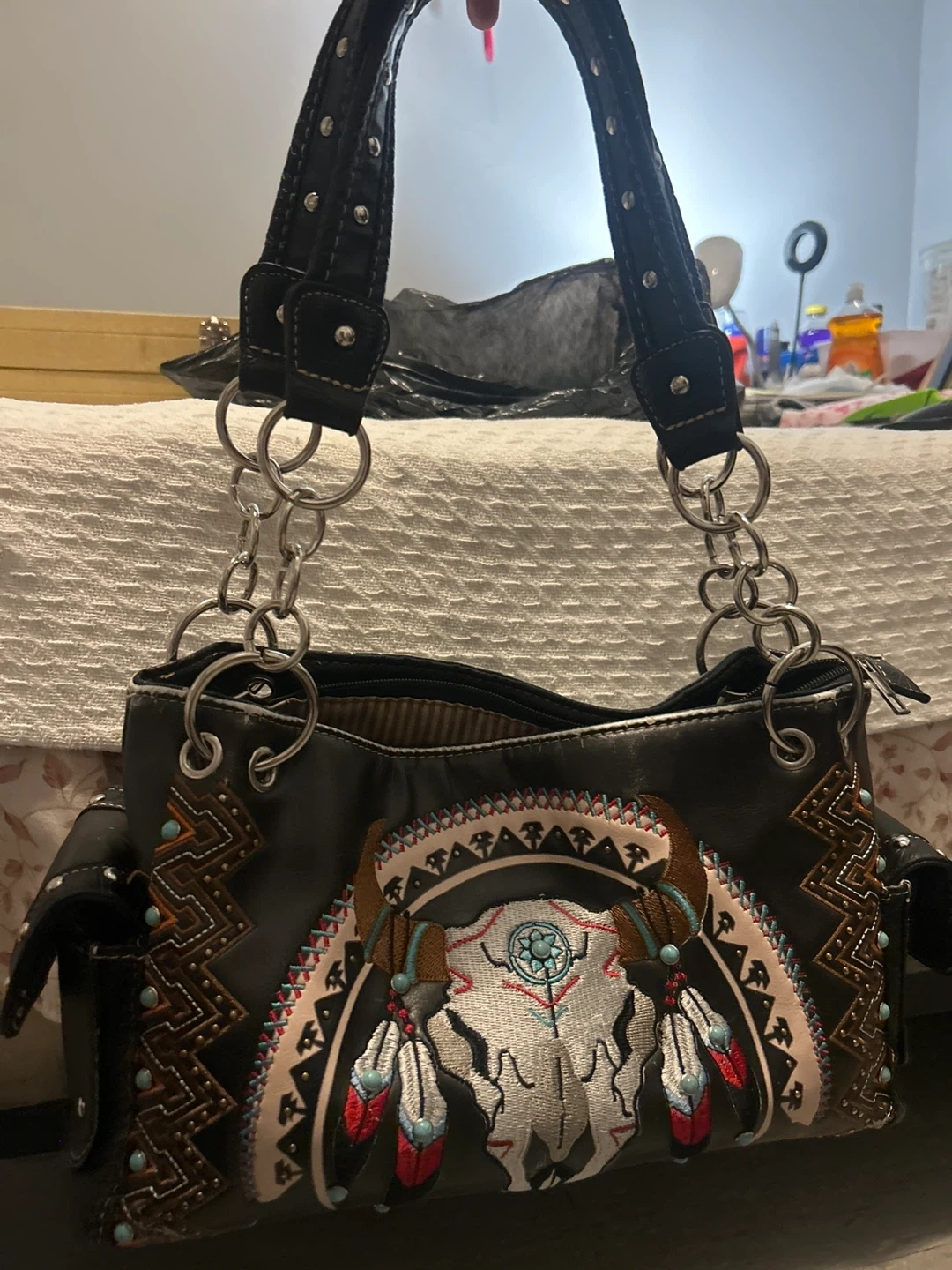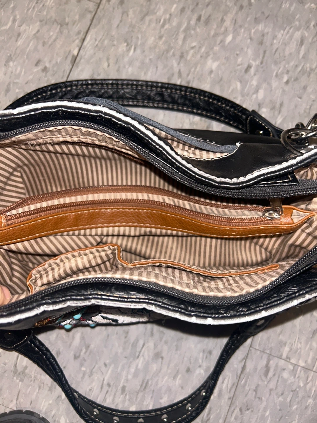 purse with Aztec embroidery. It has a black exterior with silver-tone hardware and an embroidered design featuring a bull skull and feathers. The interior is lined with a striped fabric and includes multiple pockets.