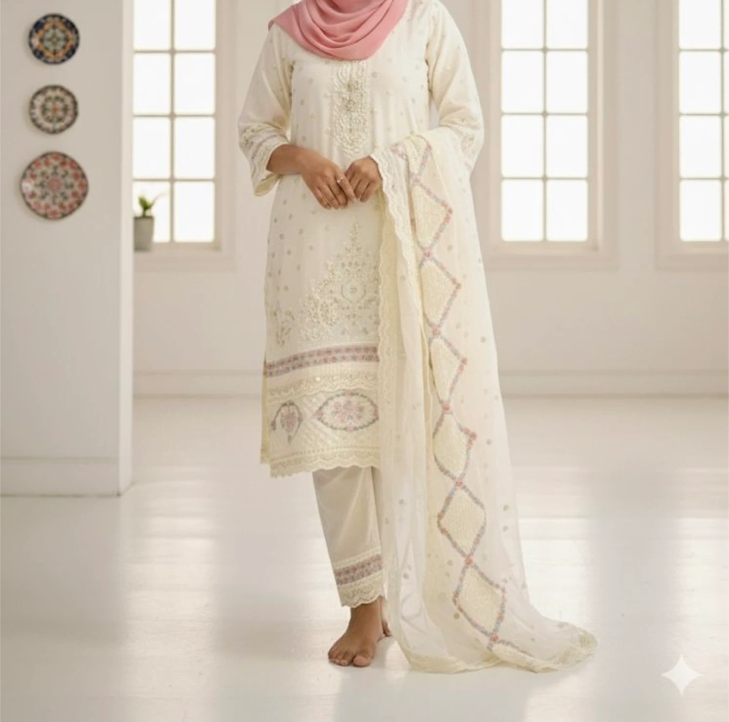 10Selling a beautiful salwar kameez suit! The fabric is a lovely off-white colour with delicate embroidery. Perfect for special occasions or everyday wear! WORE ONCE