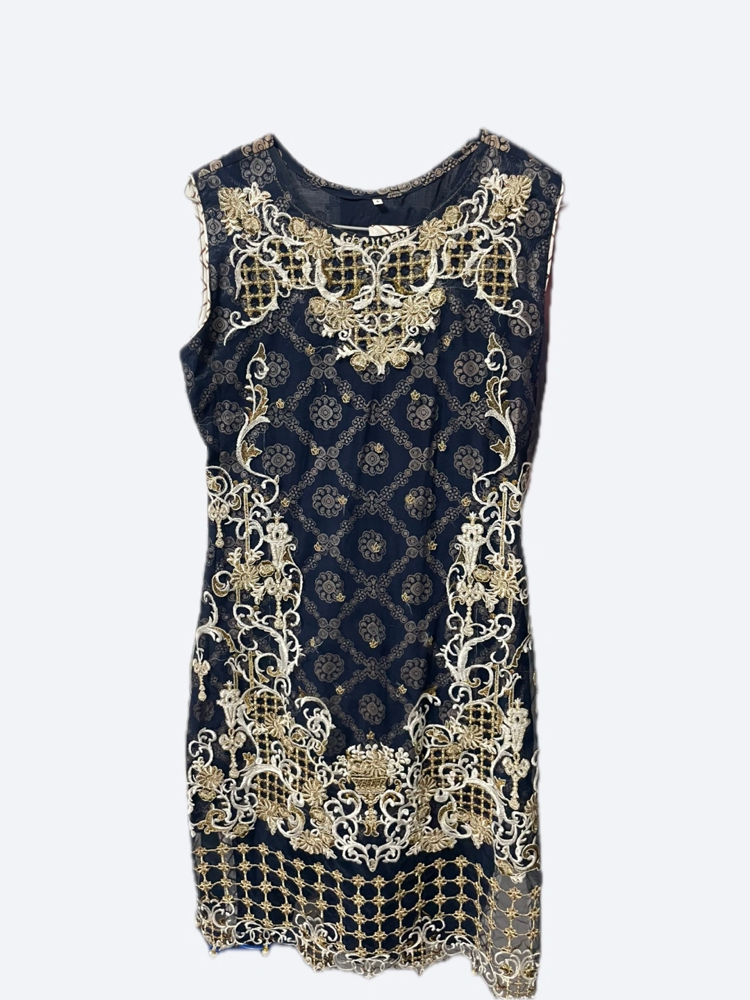 A lovely embroidered sleeveless dress with pajama. The dress features intricate gold and white embroidery on a dark blue or black background. It's perfect for a special occasion or a night out