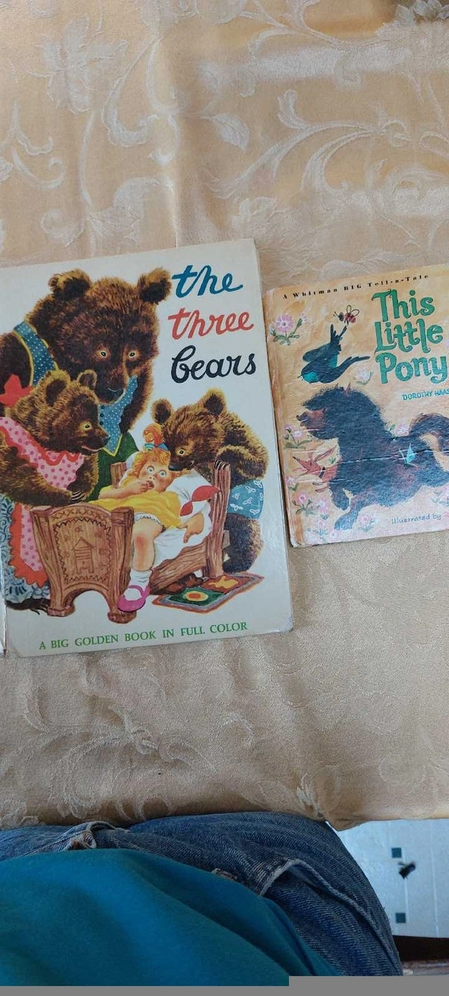 "This Little Pony" "The Three Bears" 11 X 18.5 picture of a lady in black and white 11 X 13 picture of La Chaux-de -Fonds (frame needs repair)